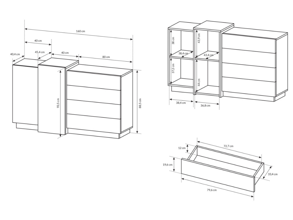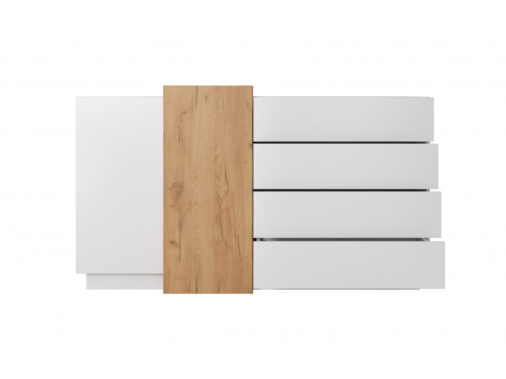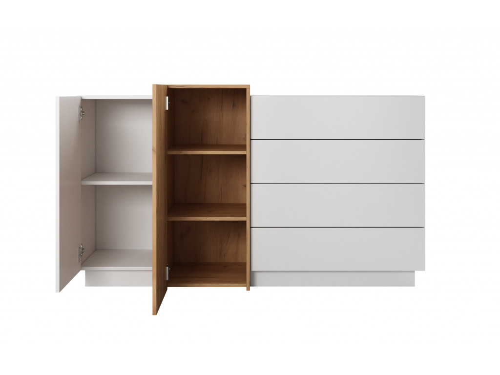 Komoda si nájde svoje miesto v obývačke, spálni, ale aj v predsieni. Obsahuje 4 praktické zásuvky a 2 skrinky s dvierkami. Za dvierkami sa nachádzajú police. Ako odkladací priestor na rôzne maličkosti dobre poslúži aj vrchná doska.