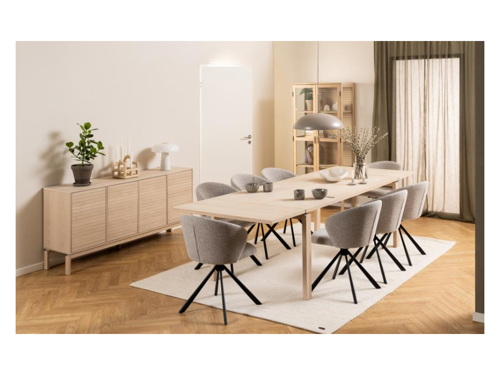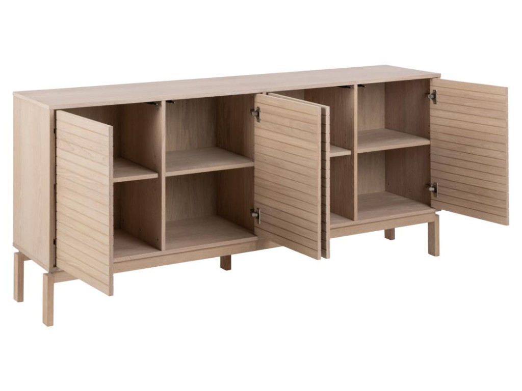 Impozantná trojmetrová „banketová“ komoda Linley rozjasní jedáleň aj obývačku jemným bielym pigmentom a prirodzenou kresbou dubu. Na prvý pohľad zaujme štyrmi lamelovými čelami – vertikálne drážky vytvárajú elegantnú hru tieňov a dodávajú nábytku hĺbku, aj keď je zachovaný čistý, škandinávsky ráz. Vďaka mechanizmu push-to-open pôsobí fasáda nerušene: stačí ľahký dotyk a dvierka sa ticho otvoria, aby odkryli štyri výškovo nastaviteľné police – ideálne na riad, textílie či sezónne dekorácie.