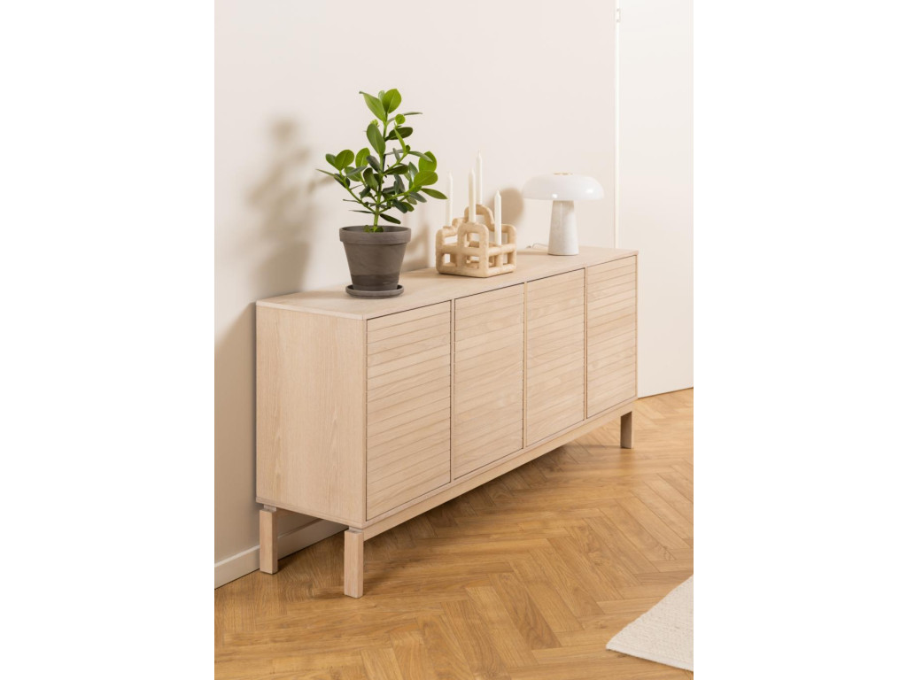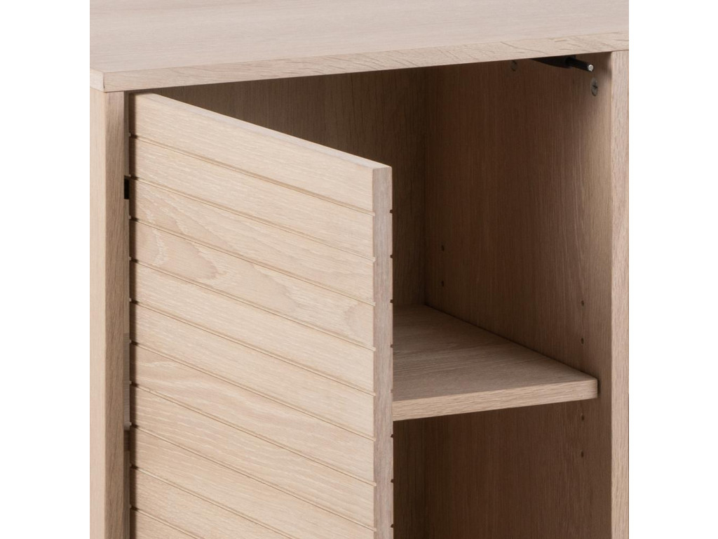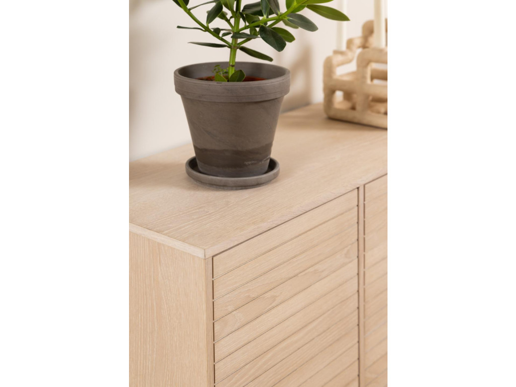 Komoda Linley 4D prináša rozšírený úložný priestor a prírodný dizajn. Vďaka štyrom dvierkam a precízne spracovanej bielenej dubovej dyhe je ideálna na organizáciu vecí bez straty štýlu. Lamelová predná časť dodáva nábytku originálny a moderný vzhľad.