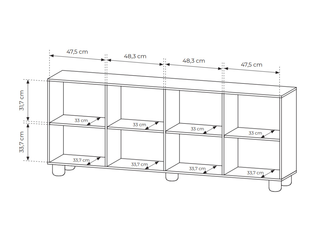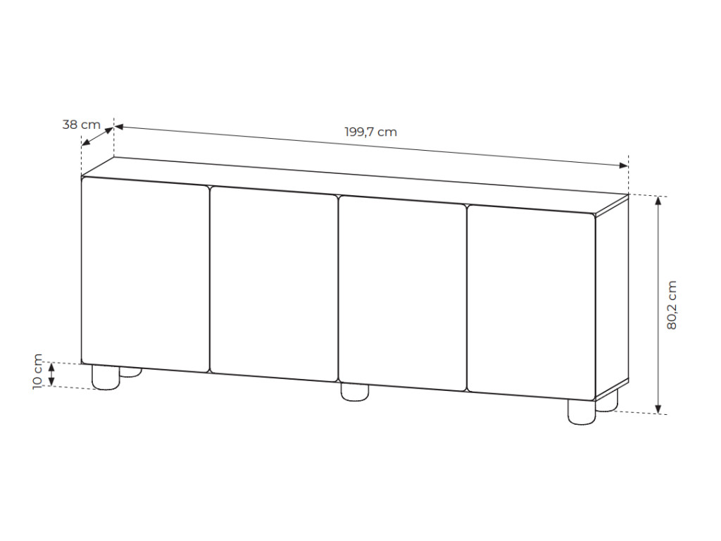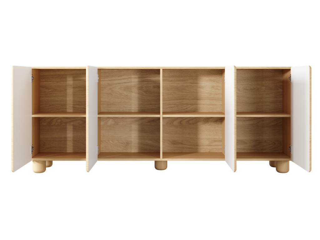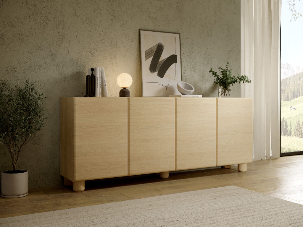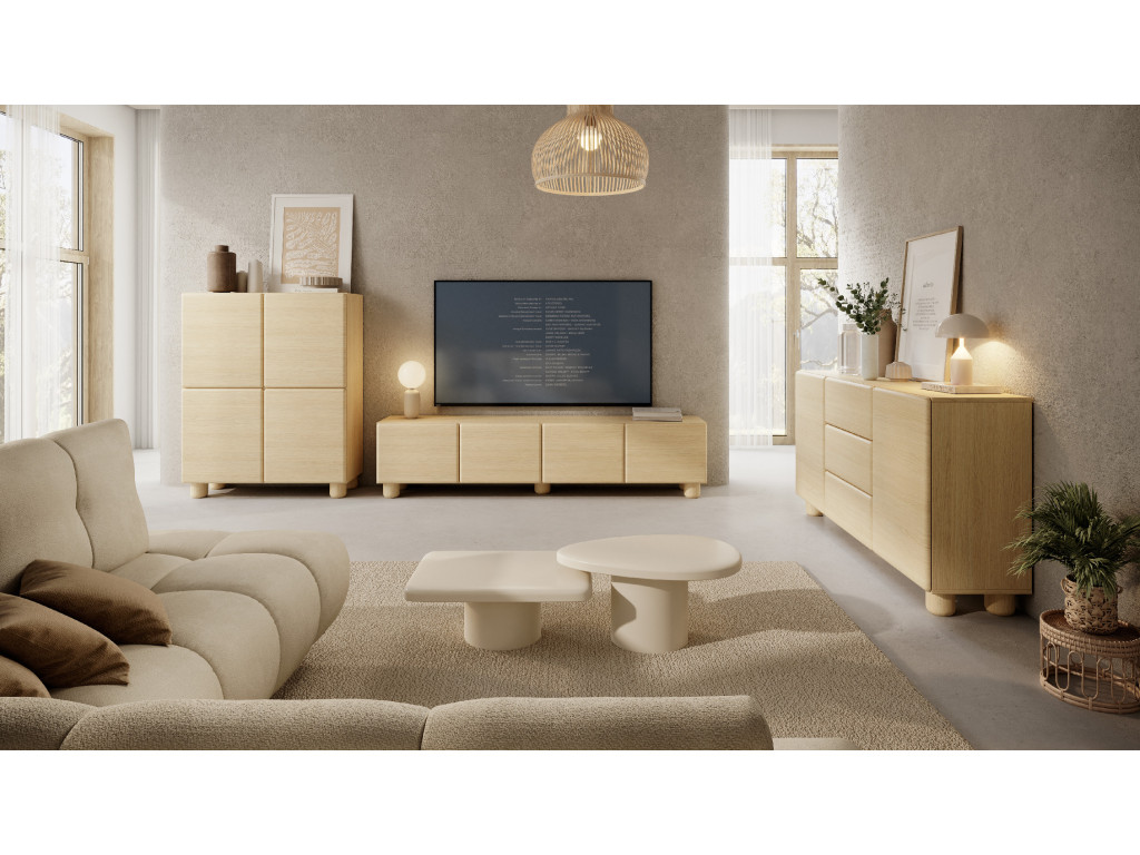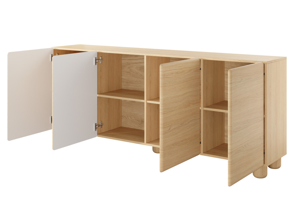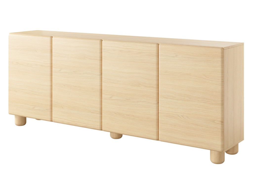 Komoda disponuje štyrmi dvierkami, za ktorými sa nachádza úložný priestor rozdelený policami. Vyhotovená je v dekore dub vicenza s dôrazom na jednoduchý a moderný dizajn. Otváranie je riešené pomocou push-to-open systému bez úchytiek. Stabilitu zabezpečujú drevené nohy. Rozmery: 199,7 x 38 x 80,2 cm