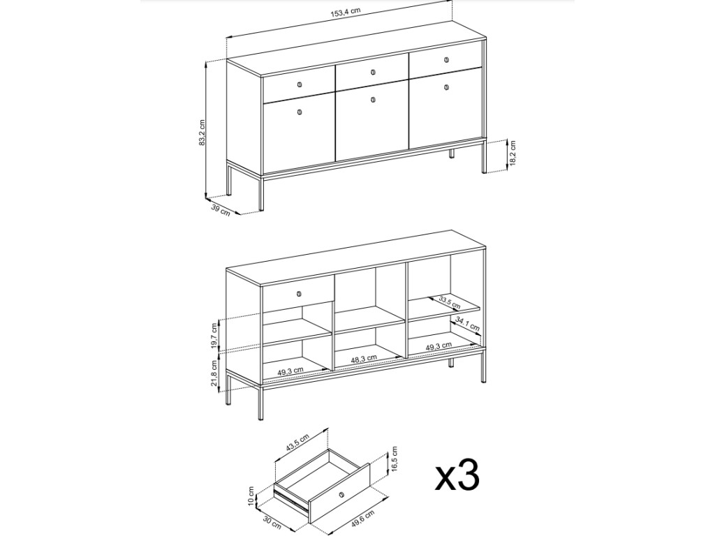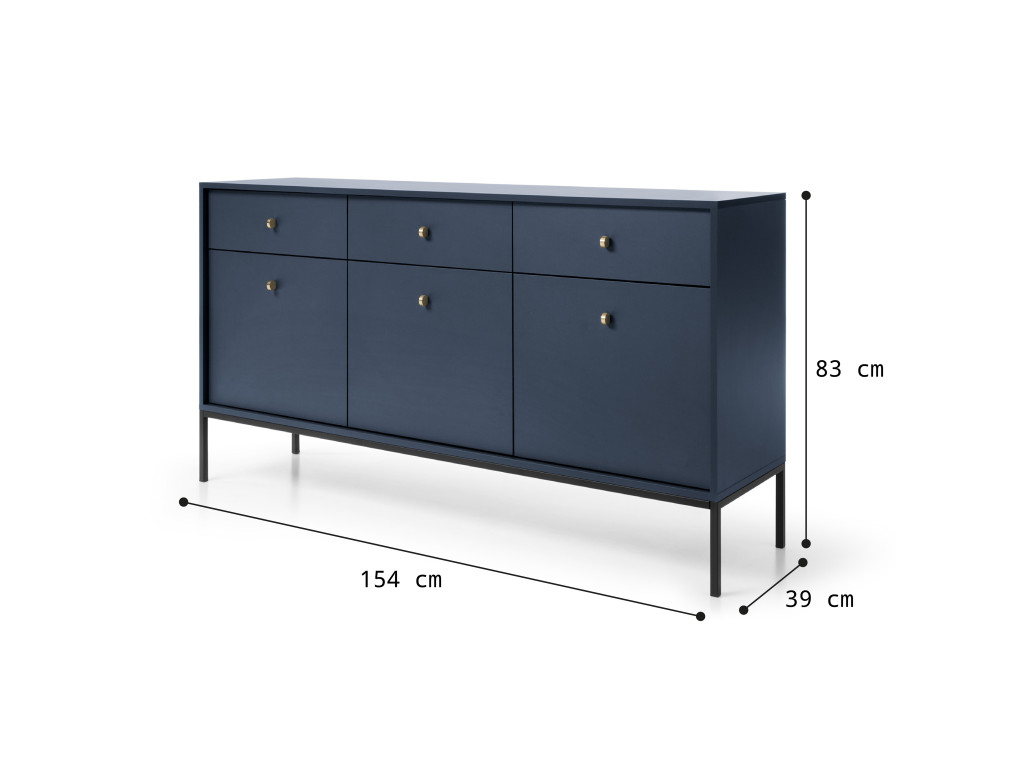 Široká komoda Mono v odtieni navy disponuje 3 hlbokými zásuvkami a 2 skrinkami na pohodlné uskladnenie všetkého, čo potrebujete. Je zhotovená z DTD a laminátu s ABS hranami, ktoré jej dodávajú vysokú odolnosť a dlhú trvácnosť.