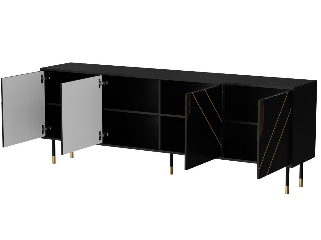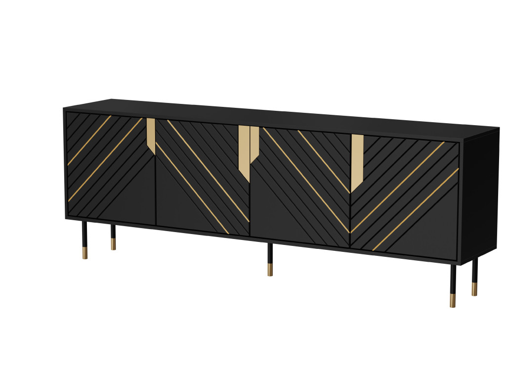 Táto široká a elegantná komoda ponúka štyri dvierka, za ktorými sa ukrýva osem praktických úložných priestorov. Vďaka veľkorysému vnútornému rozdeleniu poskytuje dostatok miesta na oblečenie, textílie či domáce doplnky. Matné čierne čelá so šikmým frézovaním, doplnené o zlaté aplikácie, vytvárajú dojem luxusu bez zbytočnej okázalosti. Ideálna voľba pre tých, ktorí chcú mať v interiéri poriadok, prehľad aj štýl.