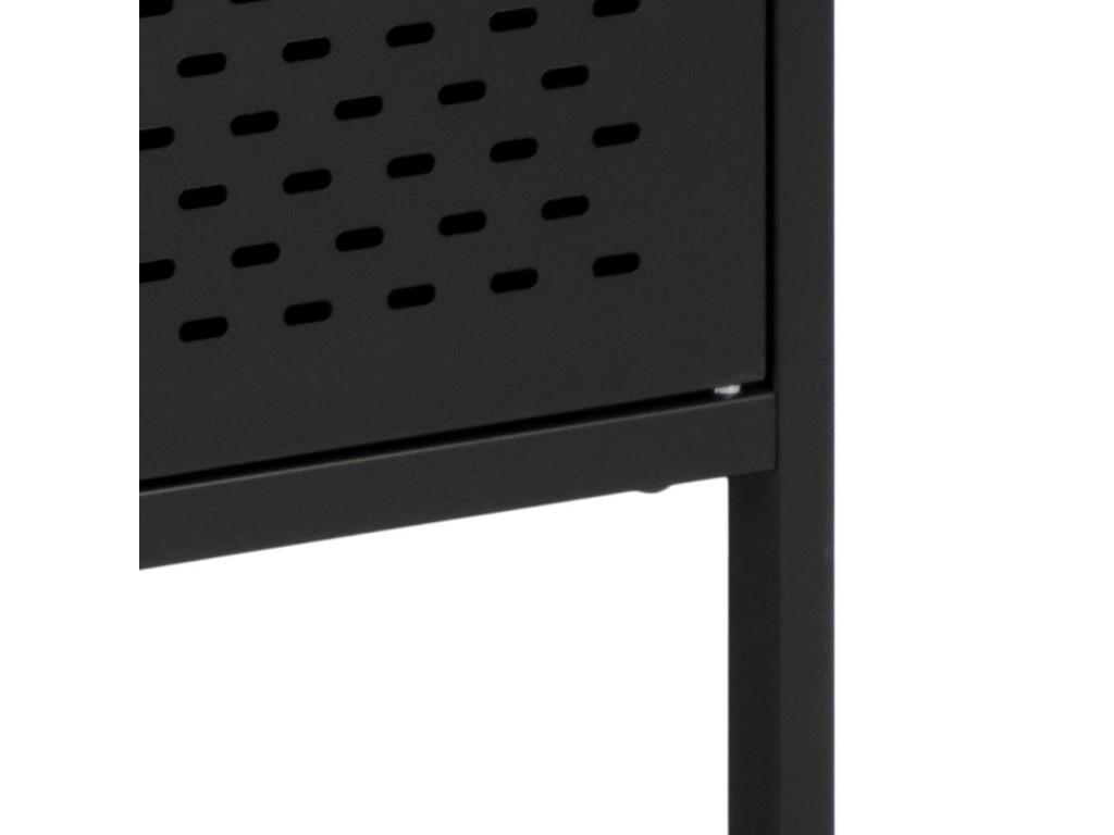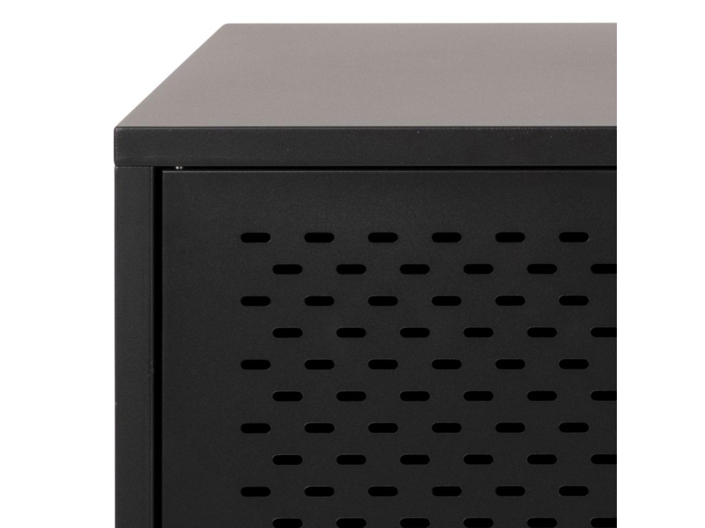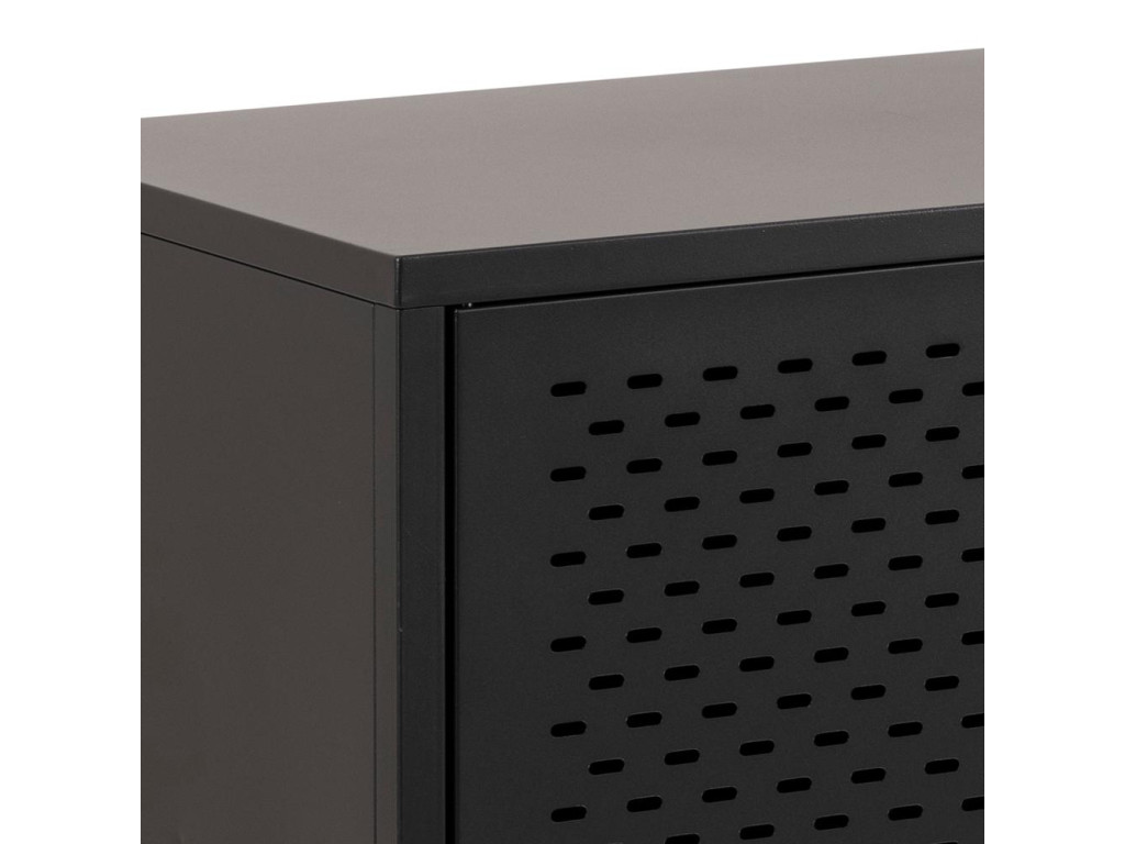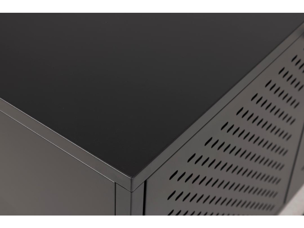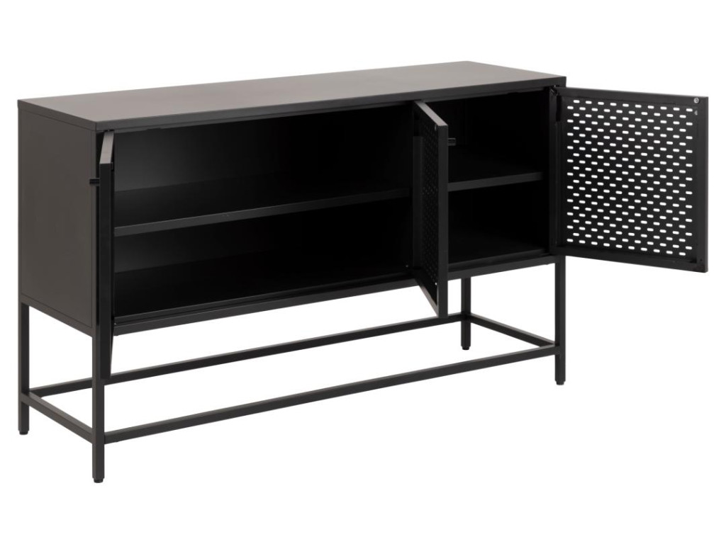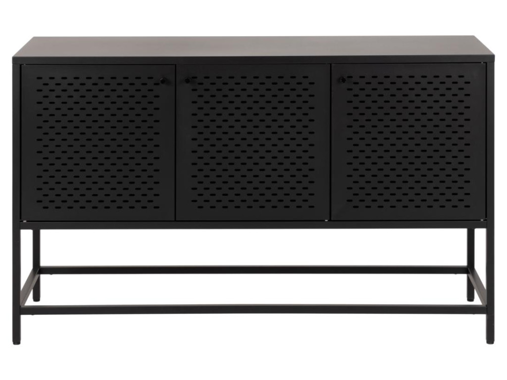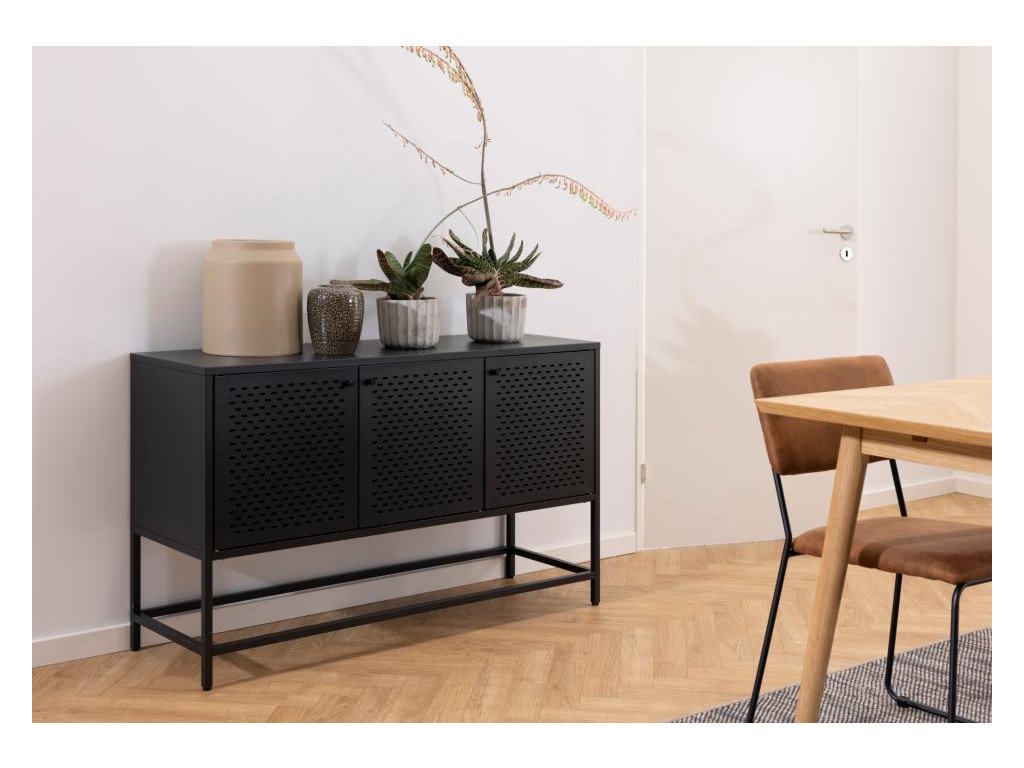 Táto komoda z kolekcie Newcastle predstavuje elegantný kontrast medzi robustným kovom a ľahkosťou perforovaných dvierok. Vyrobená je kompletne z matnej čiernej ocele s hrubým práškovým nástrekom, čo jej dodáva nezameniteľný industriálny charakter. Tri perforované dvierka skrývajú dve vnútorné police, vďaka čomu komoda ponúka štedrý úložný priestor pre všetko od riadu až po dokumenty. Vďaka svojmu modernému, čistému dizajnu je vhodná do obývačky, jedálne aj vstupnej haly – ako funkčný nábytok s dizajnovým podpisom.