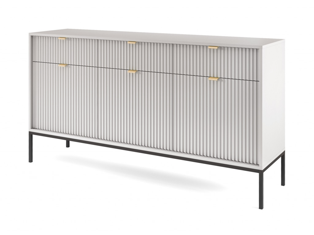 Komoda Novas v modernom dizajne vnesie do interiéru luxusný nádych. Je vyrobená z kvalitných materiálov odolných voči poškodeniu. ABS hrany ju robia odolnou voči poškodeniu. Predné drážkované časti sú doplnené o úchytky v zlatej farbe z hliníka. Komoda stojí na čiernej konštrukcii, ktorá jej dodáva ľahkosť.
