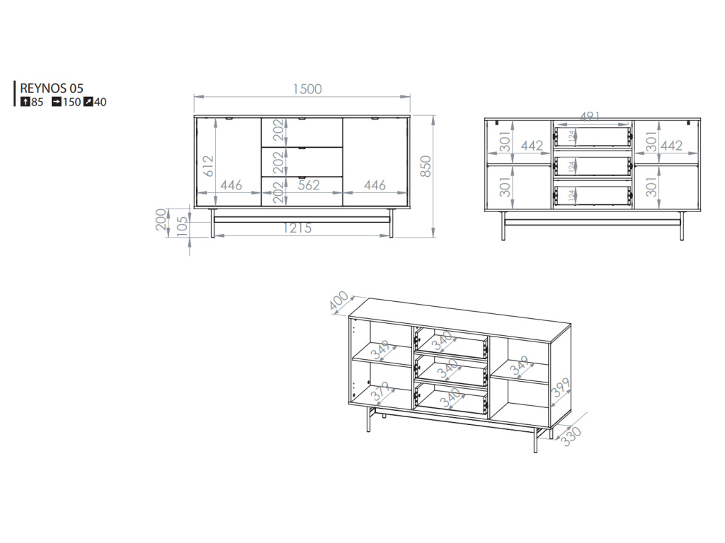 Komoda Reynos 05 ponúka premyslené riešenie úložného priestoru pre každodenné potreby. Po bokoch sa nachádzajú uzatvárateľné skrinky s policami, ideálne na oblečenie, riad alebo dokumenty. Stred tvorí trojica hlbokých zásuviek, ktoré zabezpečujú rýchly prístup k menším veciam a textíliám. Široká vrchná doska v dekore dub mavelie poskytuje priestor na dekorácie, lampu či rastliny.