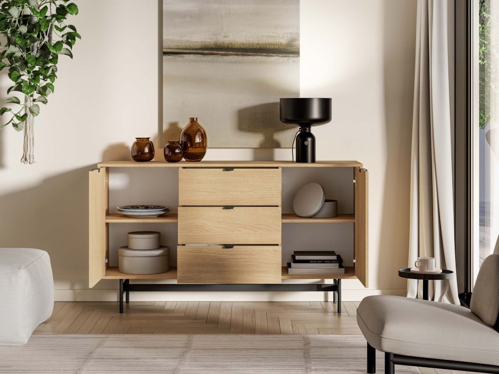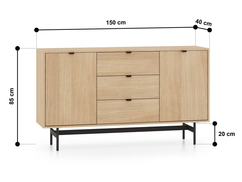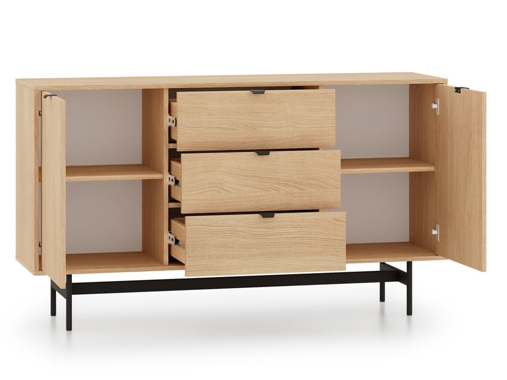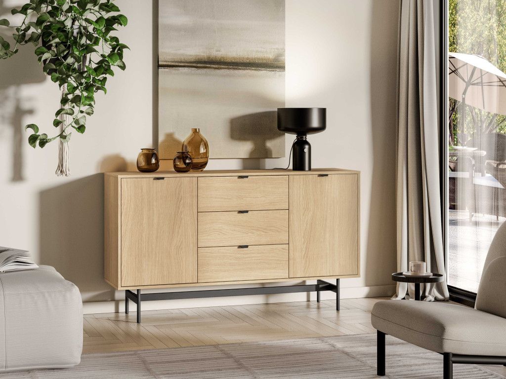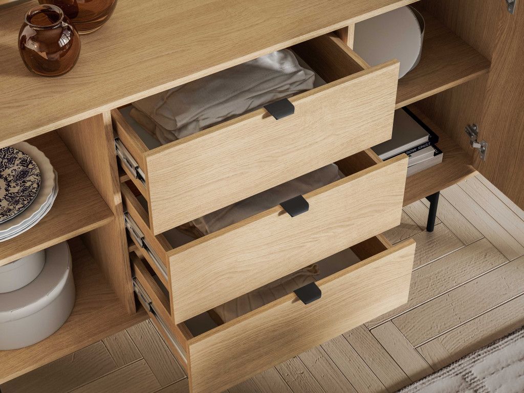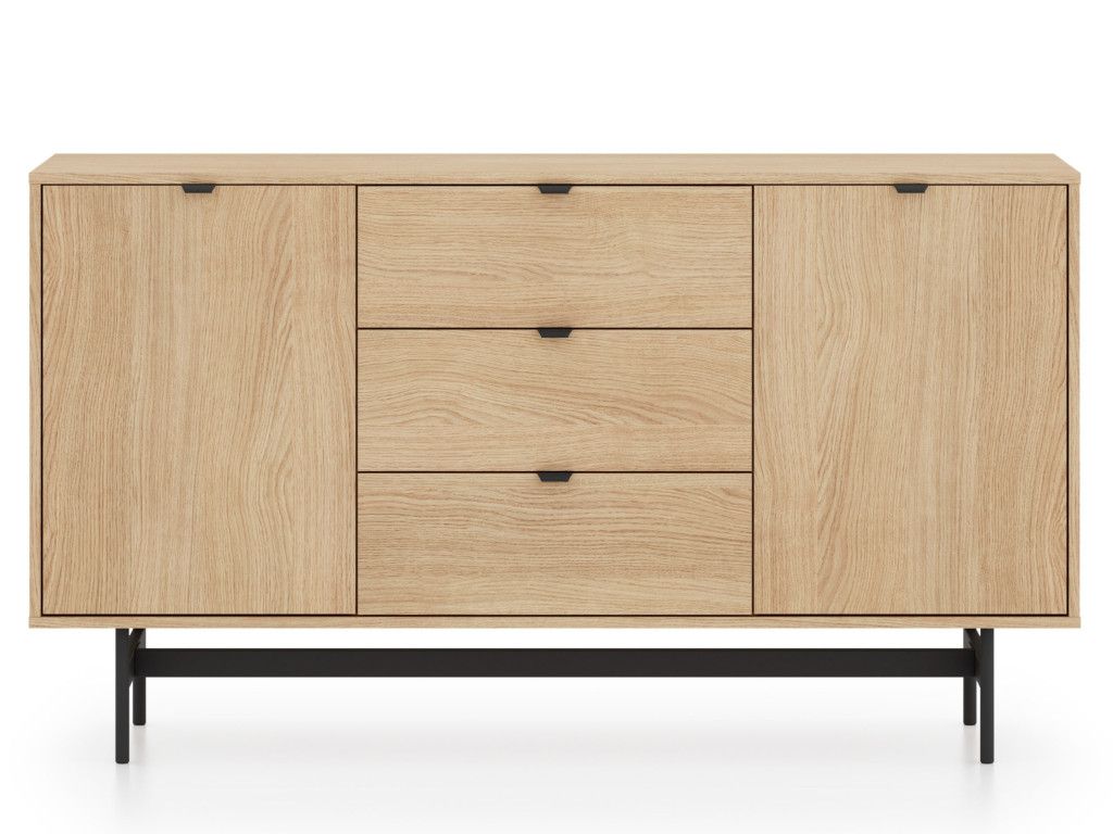 Široká komoda Reynos 05 v dekore dub mavelie ponúka dostatok úložného priestoru v modernom prevedení. Kombinácia skriniek a zásuviek umožňuje prehľadné usporiadanie vecí. Spojenie dreveného dekoru a čiernej kovovej podnože vytvára elegantný industriálny vzhľad. Plne výsuvné zásuvky a tiché dovieranie dverí zvyšujú komfort pri používaní.