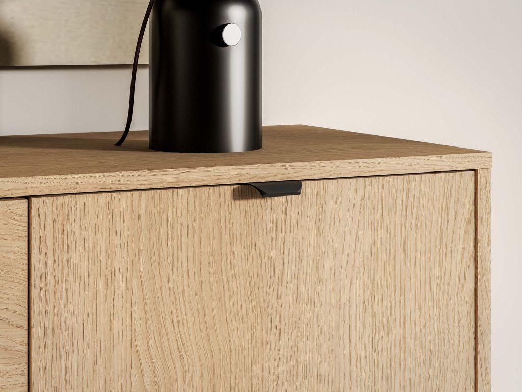 Moderný vzhľad dopĺňajú čierne hranové úchytky, kovová podnož a pánty s tichým dovieraním, ktoré zaručujú pohodlné používanie. Ideálny doplnok do obývačky aj spálne v jednotnom štýle kolekcie Reynos.