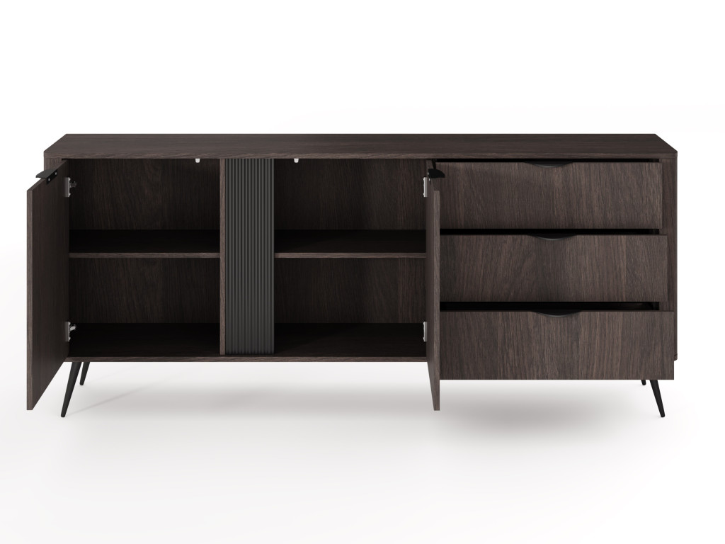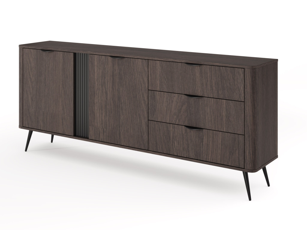 Široká komoda Veris D ponúka dokonale vyvážené spojenie zásuviek a úložného priestoru za dvierkami, čím vytvára funkčný aj vizuálne pôsobivý kus nábytku. Na jednej strane sa nachádzajú tri zásuvky, ideálne na drobnejšie predmety, textílie či dokumenty, zatiaľ čo druhá polovica patrí dvojdverovej skrinke s policami na uloženie objemnejších vecí. Charakter komody podčiarkuje ryhovaná čierna MDF lišta, ktorá kontrastuje s hlbokým odtieňom tmavého dubu dunin. Elegantné kovové úchytky v čiernej farbe, kovové nožičky a zaoblené MDF boky uzatvárajú dizajn, ktorý pôsobí robustne, no zároveň vyvážene.