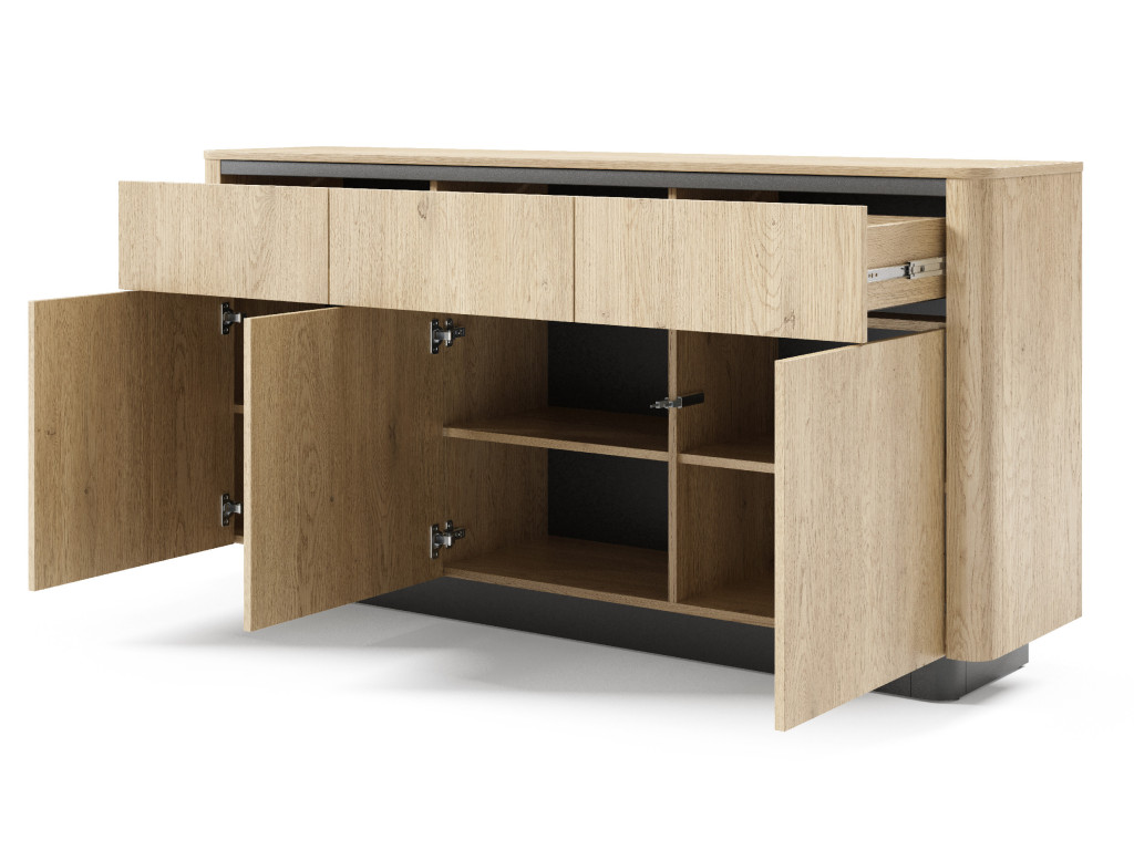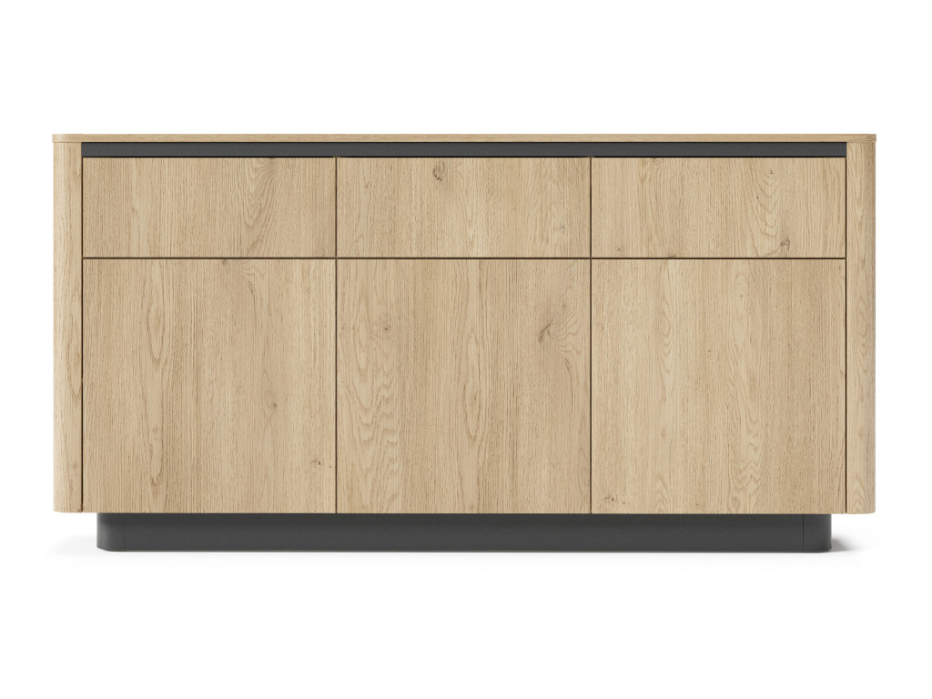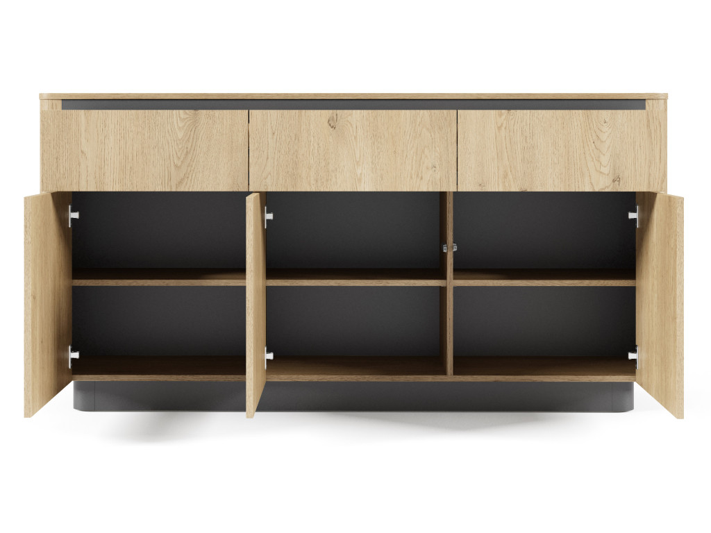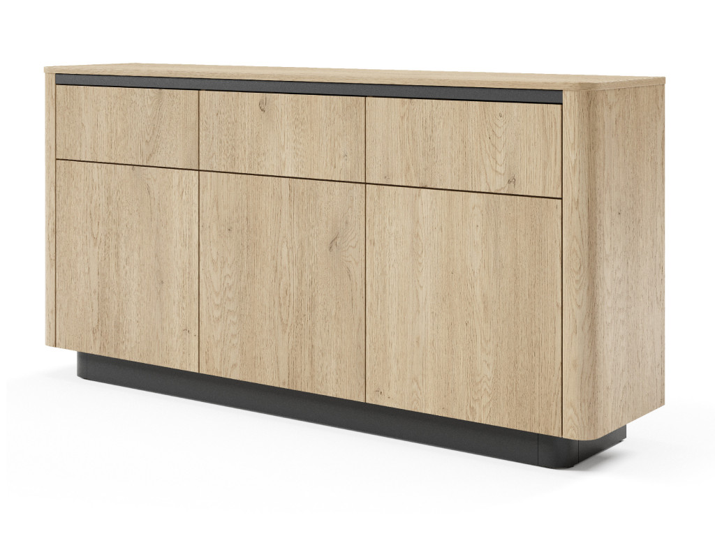 Široká komoda Toros C je impozantný, no zároveň veľmi praktický kus nábytku, ktorý ponúka priestranné riešenie pre ukladanie vo výrazne štýlovom prevedení. Vďaka trojdverovej konštrukcii s vnútornými policami a tromi zásuvkami pozdĺž celej komody, poskytuje dostatok miesta na všetko, čo chcete uložiť prehľadne a s eleganciou – či už ide o oblečenie, dokumenty alebo riad. Kombinácia čistých línií bez úchytiek, jemne zaoblených bočných líšt a čiernych dekoračných prvkov vytvára pôsobivý kontrast k svetlému dekoru dub krémový. Otváranie pomocou push-to-open systému zaručuje pohodlné každodenné používanie bez rušivých detailov.