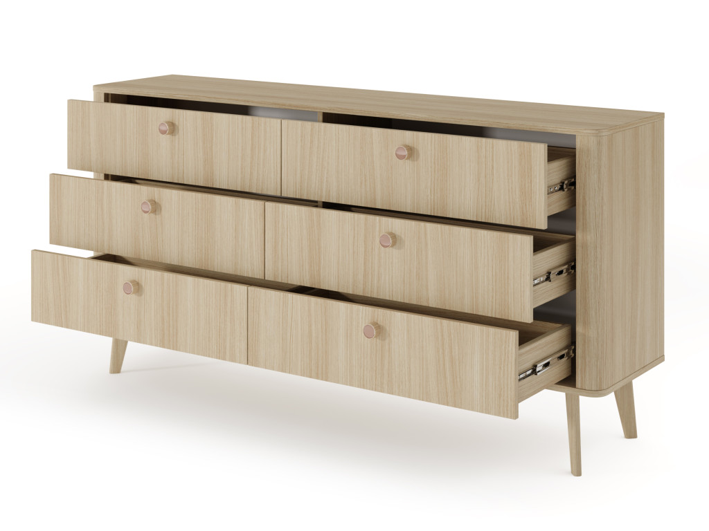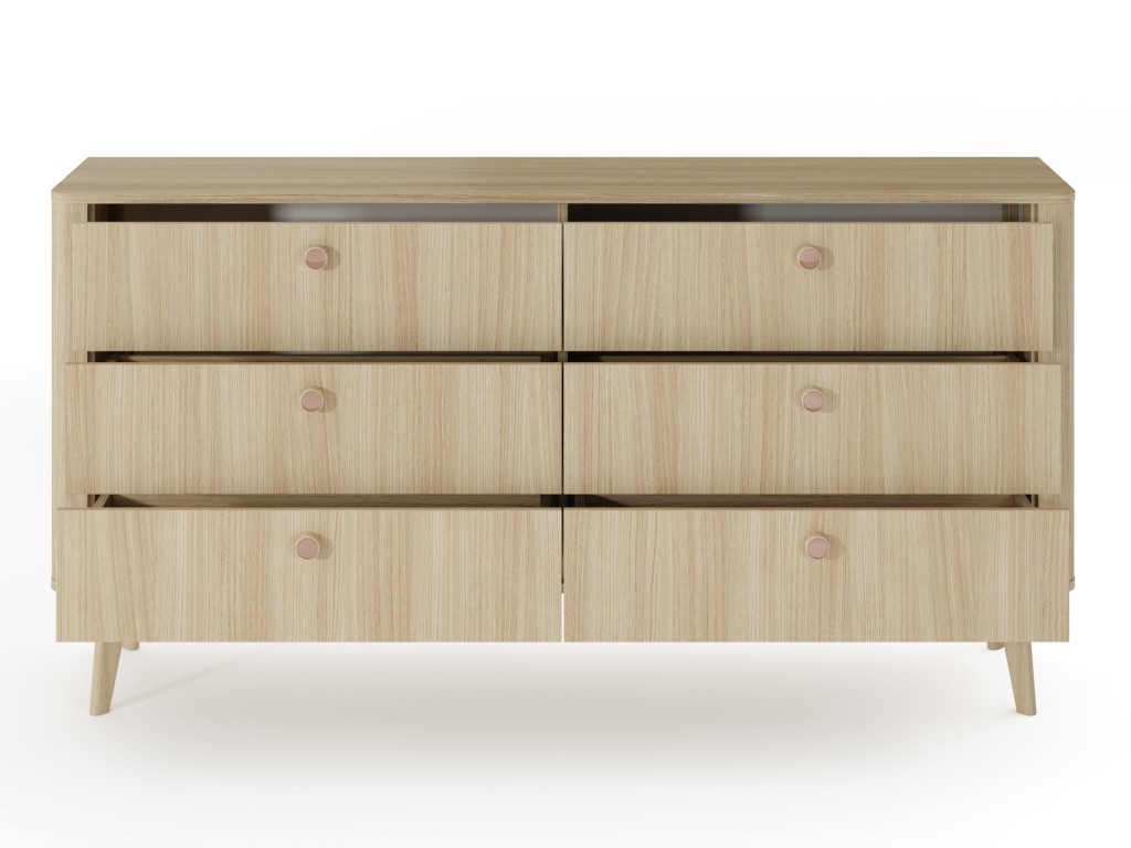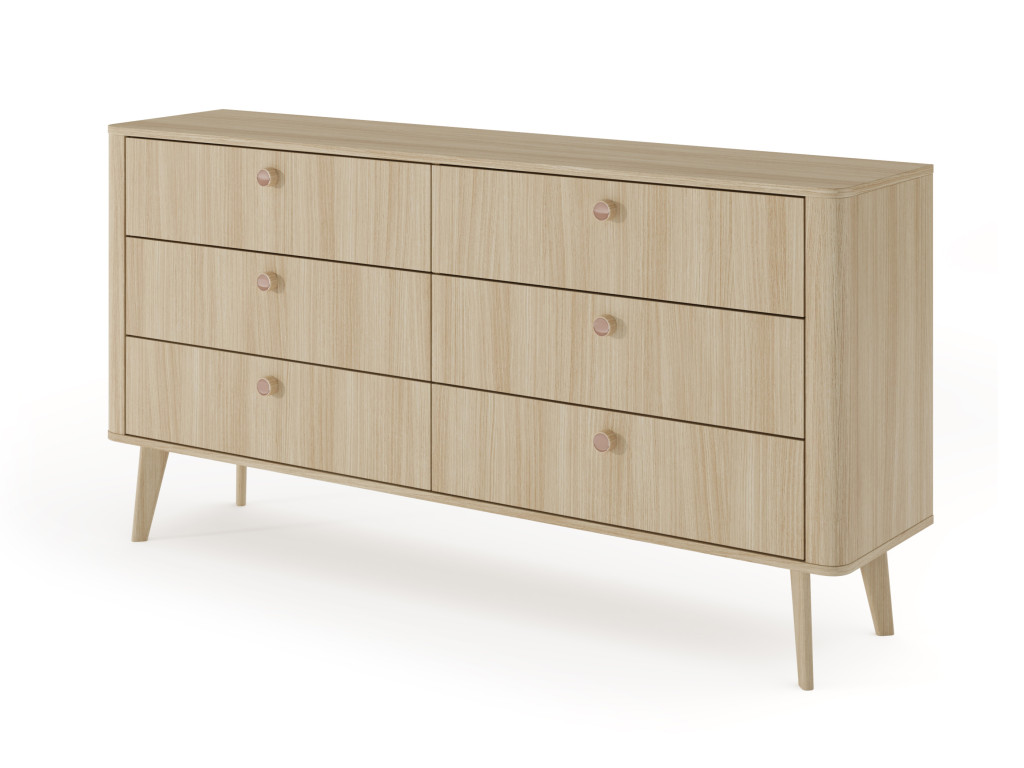 Komoda Viki C ponúka až šesť zásuviek s tichým plnovýsuvom, ideálnych na oblečenie či textílie. Teplý dekor dub barista, zaoblené hrany a drevené úchytky s moka detailom vytvárajú jemný a prirodzený vzhľad. Stojí na drevených nožičkách a zapadne do každej útulnej spálne. Spojenie funkčnosti, kvality a elegantného štýlu.