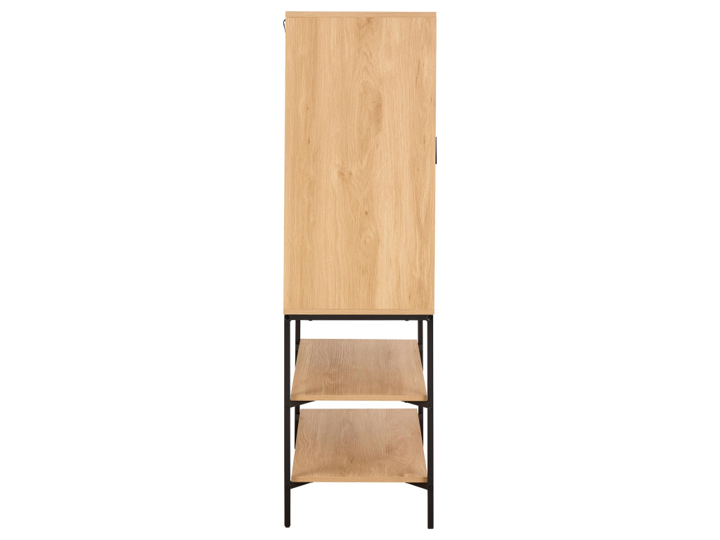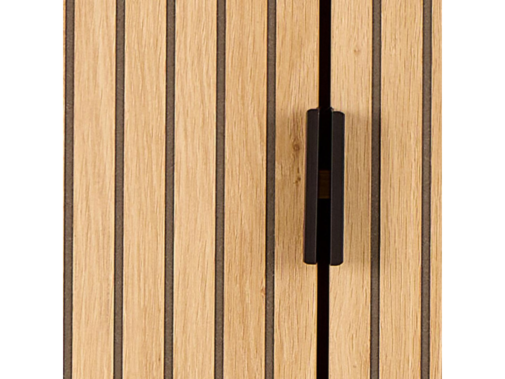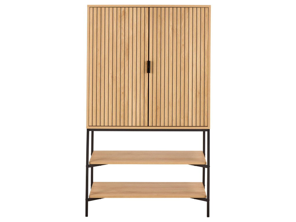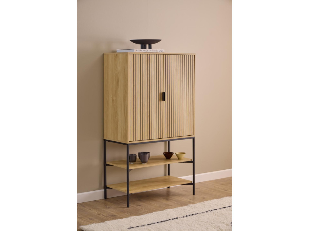 Komoda Jaipur prináša funkčný úložný priestor so štýlovým lamelovým čelom. Vyhotovená z melamínu s povrchom v dekore dub a doplnená o čiernu oceľovú základňu, pôsobí robustne a moderne. Dvojica dvierok ponúka dostatok priestoru pre domáce textílie či riad. Komoda je ideálna do moderných interiérov so zemitými tónmi.