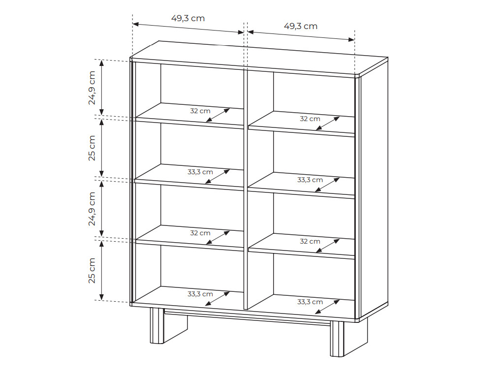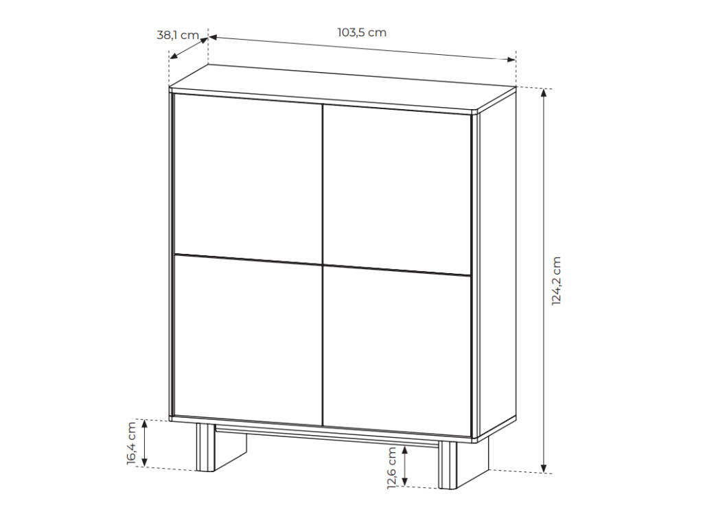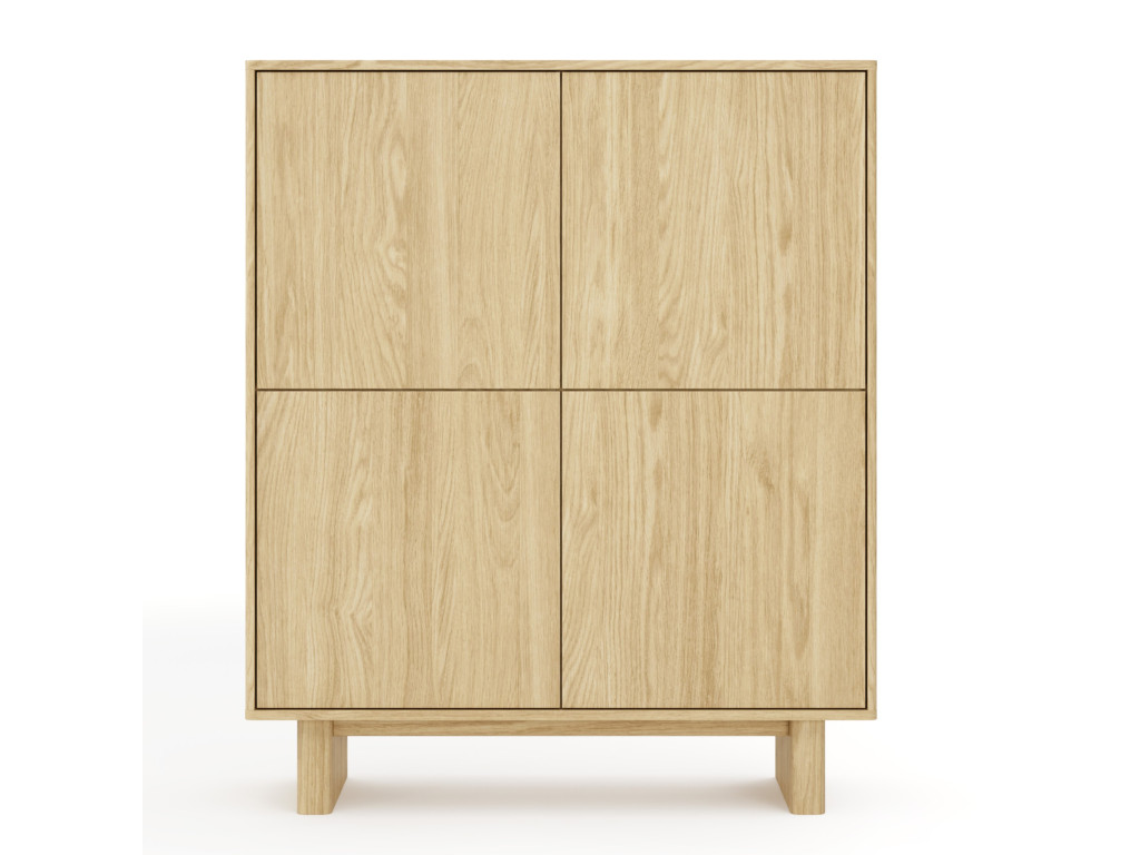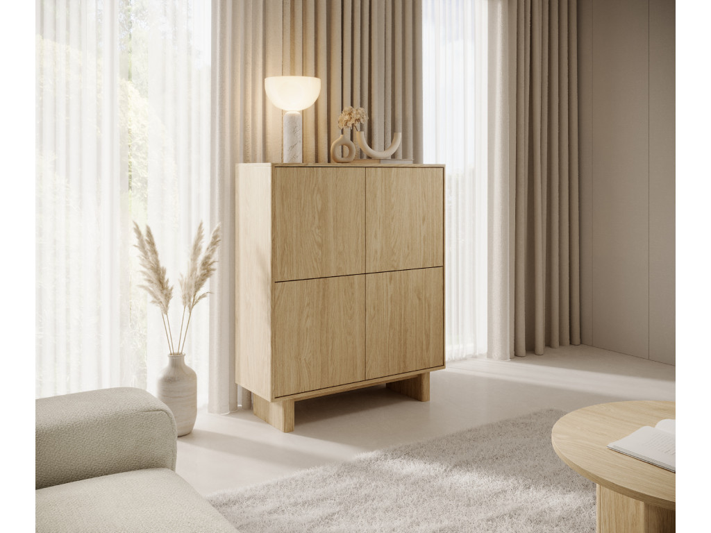 Komoda disponuje štyrmi dvierkami, za ktorými sa nachádza úložný priestor rozdelený policami. Vyhotovená je v dekore dub olejovaný s dôrazom na zaoblené hrany a čisté prevedenie. Otváranie je riešené pomocou push-to-open systému bez úchytiek.