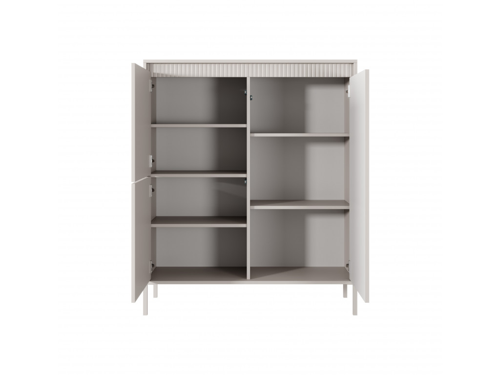Béžová komoda Senso ponúka úložný priestor v podobe 3 skriniek s dvierkami. Vnútro skriniek je prakticky rozdelené na menšie časti prostredníctvom políc. Vysoká komoda stojí na úzkych nožičkách a skrášľuje ju zaujímavé frézovanie v prednej časti.