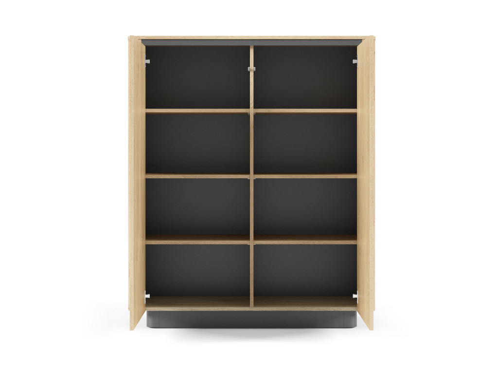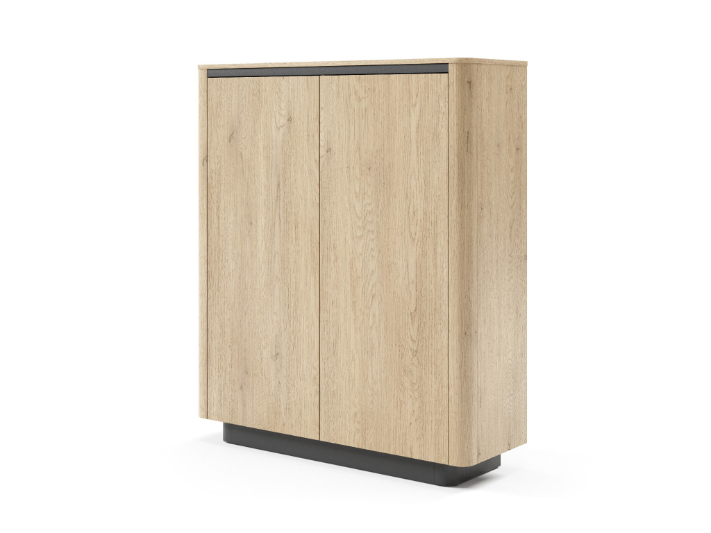 Vysoká komoda Toros B v prevedení dub krémový / čierna je elegantný a výrazný kus nábytku, ktorý ponúka veľkorysý úložný priestor za dvomi dvierkami. Vnútorné police umožňujú uložiť všetko, čo potrebujete mať po ruke, no zároveň skryté – od oblečenia cez dokumenty až po doplnky do domácnosti. Vďaka bezúchytkovému push-to-open systému pôsobí komoda mimoriadne čisto a moderne. Dizajn dopĺňajú čierne dekoračné detaily, ako je horná lišta, sokel a zaoblené MDF bočné prvky, ktoré vytvárajú štýlový kontrast k teplému tónu dreva.