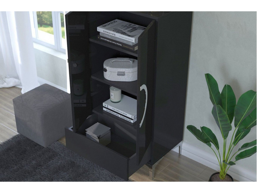 Moderná komoda s dynamickým tvarom rozžiari každý interiér. Jej lesklý povrch a ozdoba v podobe kruhu umiestneného na čelných stranách dverí mu dodávajú jednoduchý vzhľad. Celok zvýrazňujú kovové nohy z chrómovanej ocele. Jednoduchá a minimalistická forma, lesklý povrch a moderná dekorácia v podobe zrkadlového kruhu na prednej strane sú prvky, ktoré ho odlišujú od ostatného nábytku tohto typu na trhu. Modernistický štýl dopĺňajú oceľové, chrómové nohy, ktoré so zrkadlovým dekorom a čiernou farbou dodávajú komode jedinečnosť.