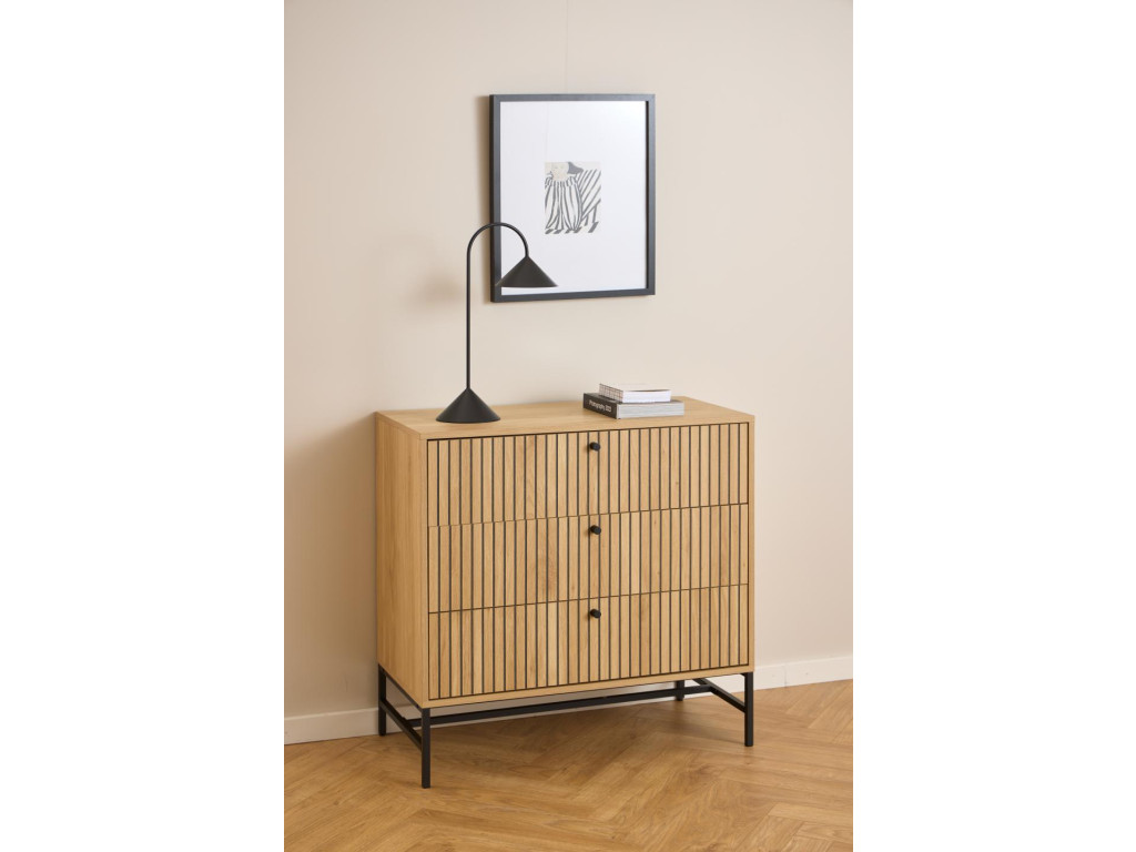 Obdĺžniková komoda Albany je výrazným kúskom, ktorý zaujme na prvý pohľad svojím lamelovým čelom a kontrastom medzi dubovým dekorom a matne čiernou oceľou. S kompaktnými rozmermi 80,6 × 40 × 80,4 cm je ideálnou voľbou do menších priestorov, kde je potrebné spojiť dizajn s praktickým riešením. Tri priestranné zásuvky poskytujú dostatok úložného priestoru na organizáciu vašich vecí, zatiaľ čo odolný povrch z drsného melamínu uľahčuje údržbu.