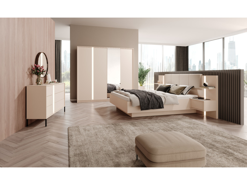 Kolekcia Dast spája moderný minimalistický dizajn so špičkovou funkčnosťou. Vyznačuje sa prevedením v elegantnej béžovej farbe, doplneným o čisté línie a riešenie push-to-open bez viditeľných úchytiek. Podľa typu nábytku stojí buď na sokli vo farbe korpusu, alebo na čiernych kovových nohách, ktoré mu dodávajú vzdušnosť.