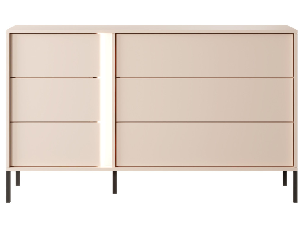 Zásuvková komoda Dast – béžová s rozmermi 137,3 × 39,5 × 81,4 cm ponúka 6 zásuviek – širšie na pravej a užšie na ľavej strane a stabilné čierne kovové nohy. Moderný dizajn si jednoducho môžete doplniť o LED osvetlenie za doplatok. Nosnosť komody je 15 kg.