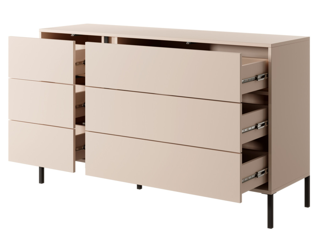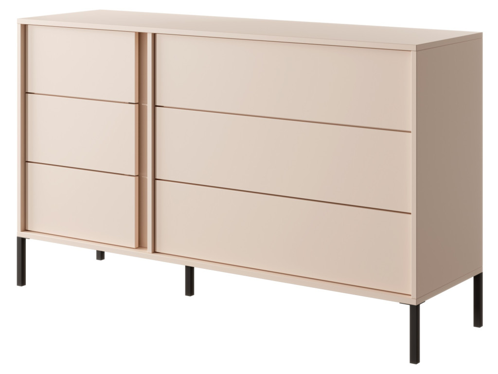 Zásuvková komoda Dast je elegantný a praktický kus nábytku v modernom štýle. Vyhotovená je v jemnej béžovej farbe a stojí na stabilných čiernych kovových nohách, ktoré jej dodávajú vzdušnosť a ľahkosť. Komoda má 6 zásuviek – na pravej strane sú širšie zásuvky, na ľavej užšie zásuvky, čo umožňuje prehľadné uloženie rôznych predmetov.