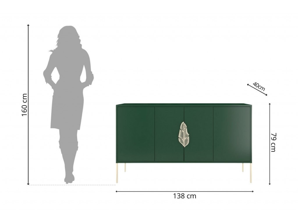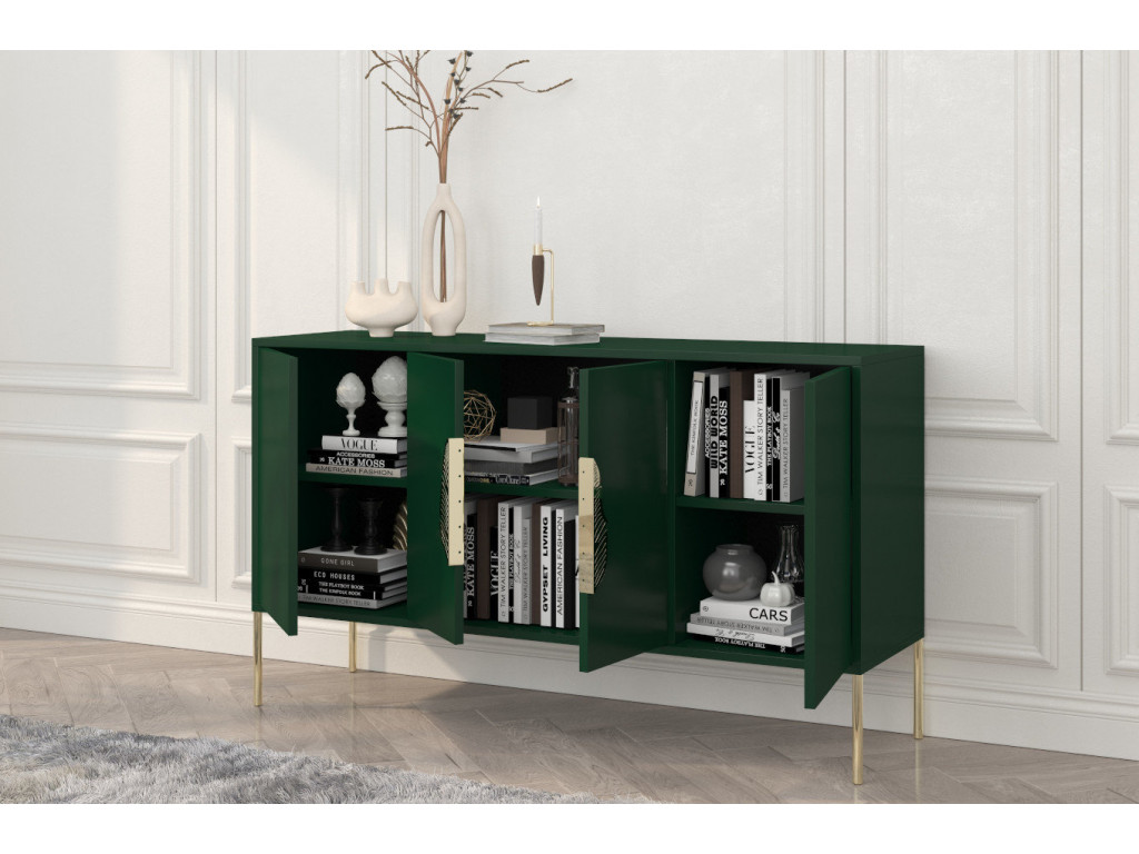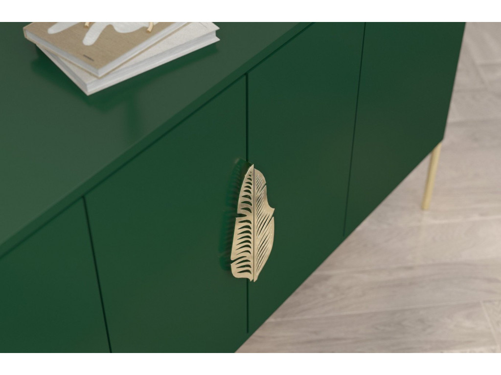 Štvordverová komoda v zelenej farbe so zlatými prvkami vhodná do každého štýlu. Ide o elegantný kus nábytku, ktorý vám pomôže udržať predmety každodennej potreby pod kontrolou. Komoda Merlin je elegantný kus nábytku na odkladanie rôznych drobností, ktorý si získava srdcia jednoduchou siluetou odetou do štýlových doplnkov. O jeho krásu sa stará krásna, veľká, nepravidelná, dvojdielna kovová rukoväť v tvare listu, ktorá dokonale ladí s nohami rovnakej farby. Tento pútavý detail otvára dvierka v centrálnej časti nábytku, pričom dvierka na ľavej a pravej strane nábytku sa otvárajú systémom „push to open“.