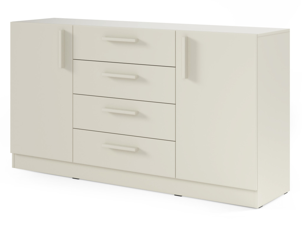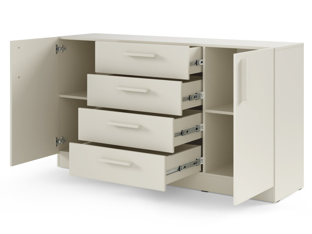 Široká komoda Braga BRK1 ponúka kombinovaný úložný priestor. Po stranách sa nachádzajú skrinky s dvierkami, v strede sú štyri zásuvky s plným výsuvom pre jednoduchý prístup k uloženým veciam.