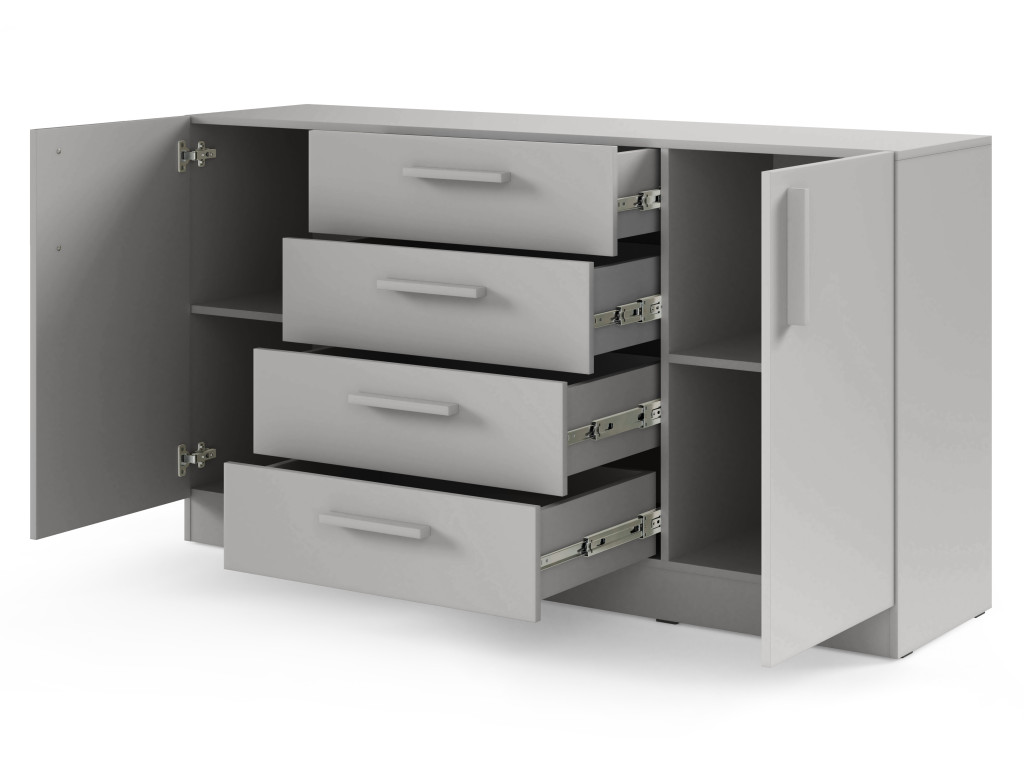 Široká komoda Braga BRK1 ponúka kombinovaný úložný priestor. Po stranách sa nachádzajú skrinky s dvierkami, v strede sú štyri zásuvky s plným výsuvom pre jednoduchý prístup k uloženým veciam.