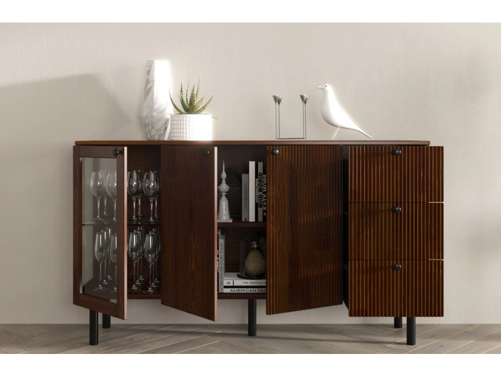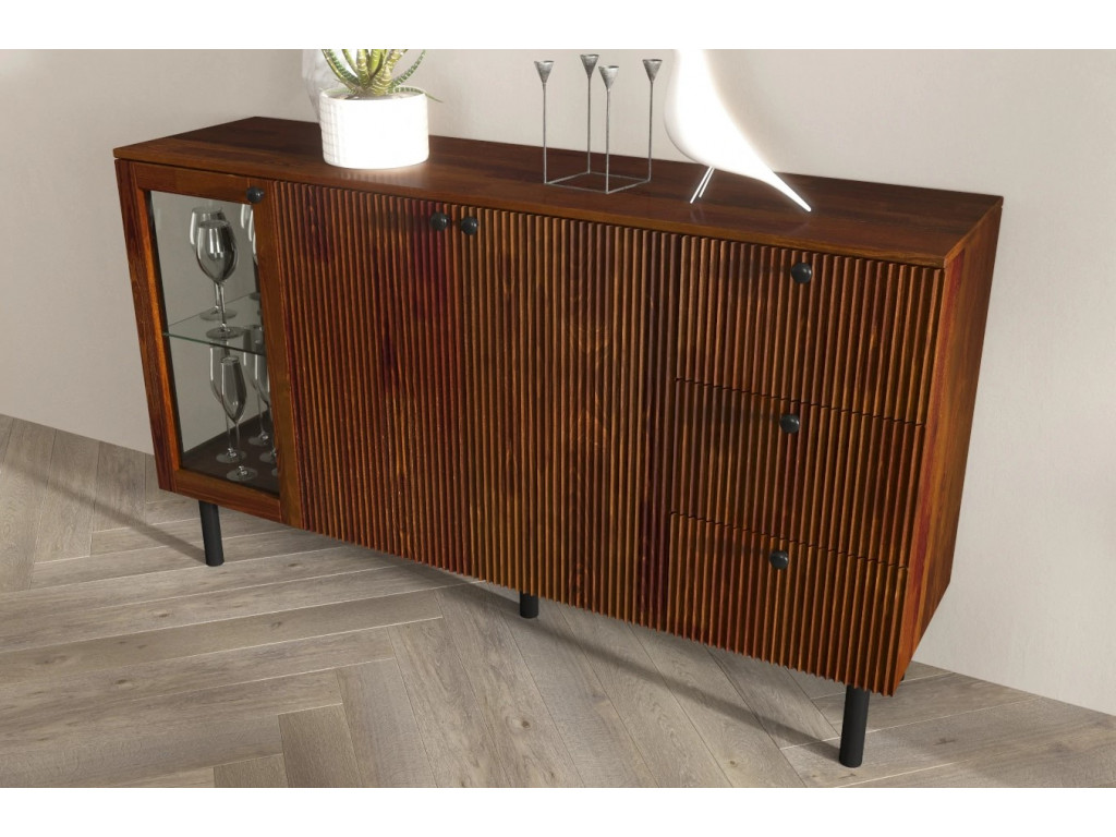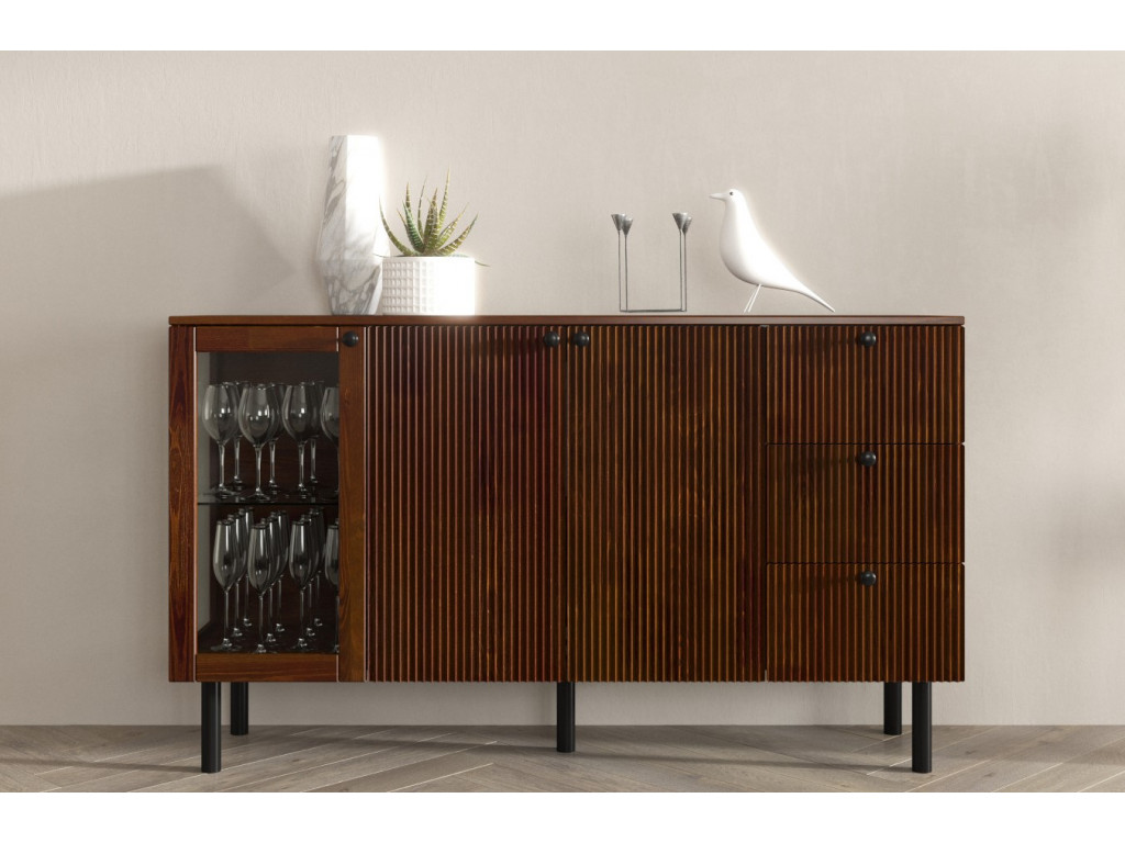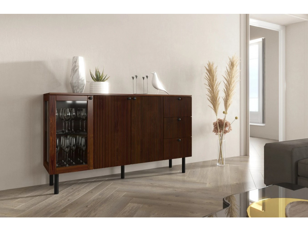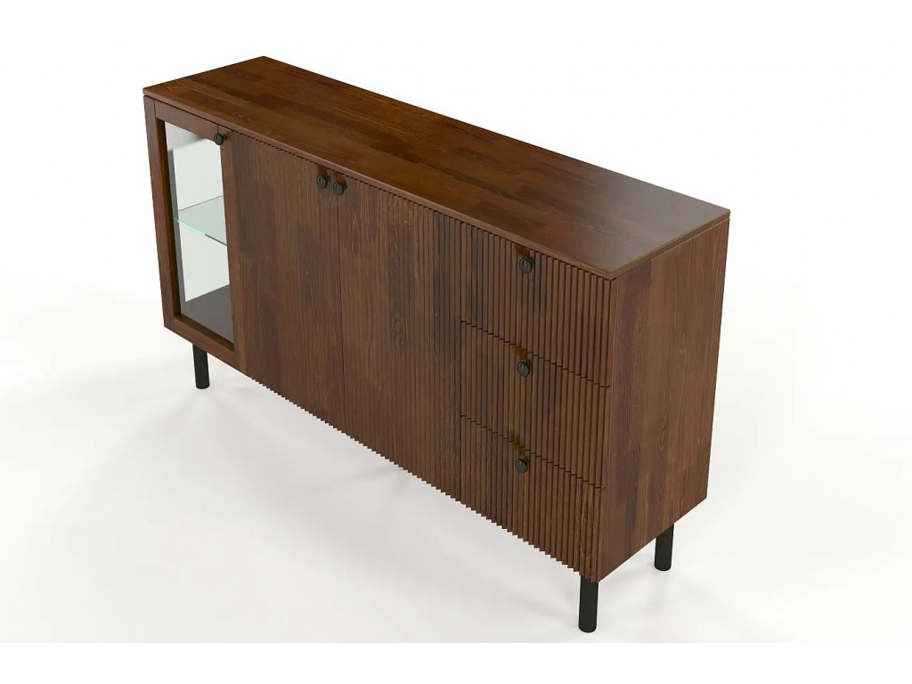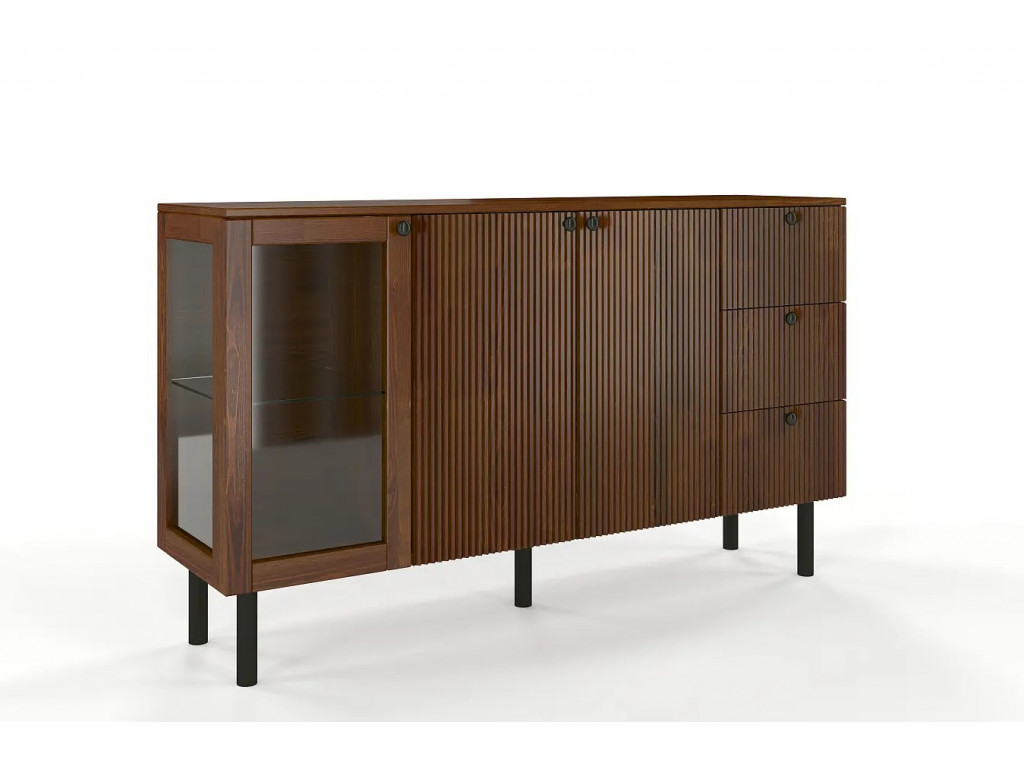 Elegantný a funkčný kus nábytku, sa bude skvele hodiť do obývačky, pracovne aj jedálne. Na jej ľavej strane sa nachádza skrinka s preskleným čelom. Centrálnu časť komody tvorí dvojdverová skrinka s policou vo vnútri. Pravú stranu tvoria 3 zásuvky. Čelá drevených dvierok a zásuviek zdobí efektné vertikálne frézovanie, ktoré dodáva celku moderný charakter.