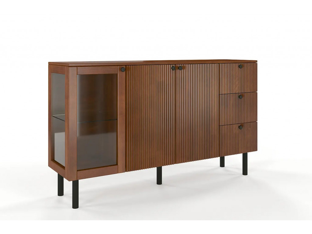 Elegantný a funkčný kus nábytku, sa bude skvele hodiť do obývačky, pracovne aj jedálne. Na jej ľavej strane sa nachádza skrinka s preskleným čelom. Centrálnu časť komody tvorí dvojdverová skrinka s policou vo vnútri. Pravú stranu tvoria 3 zásuvky. Čelá drevených dvierok a zásuviek zdobí efektné vertikálne frézovanie, ktoré dodáva celku moderný charakter.
