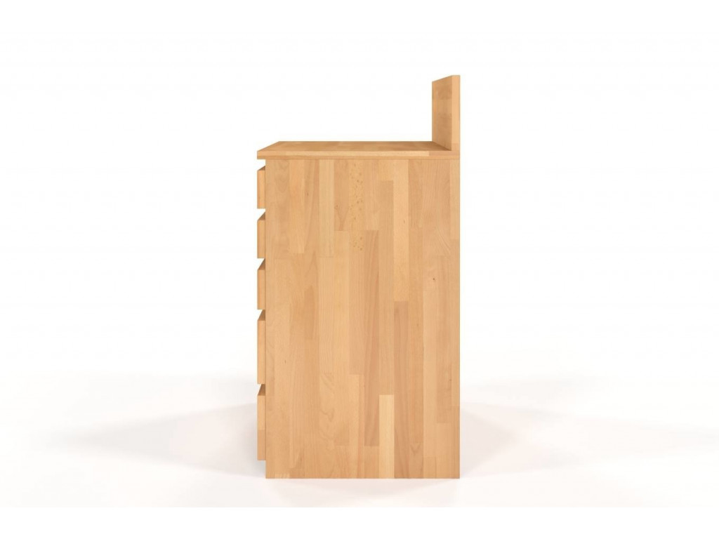 Masívna komoda z buka s ôsmimi zásuvkami, ktoré majú široké obdĺžníkové výrezy namiesto úchytiek. Jej neobvyklý dizajn spestrí interiér a zvýšený zadný diel dodá nábytku jedinečný charakter.