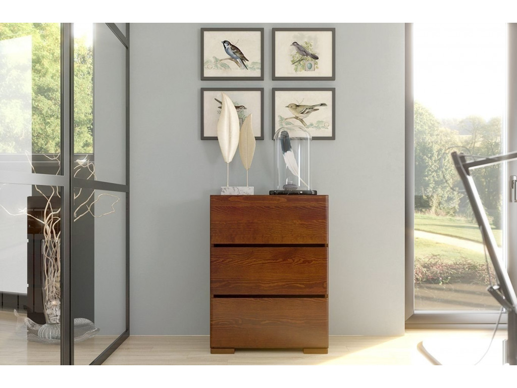 Komoda z masívu poteší spratnou šírkou 60 cm a 3 zásuvkami so systémom tichého zatvárania. Má hladkú prednú časť, jednoduchú formu a žiadne úchytky. Najharmonickejšiu atmosféru v interiéri vytvorí spolu s ostatným nábytkom z kolekcie Sandemo.