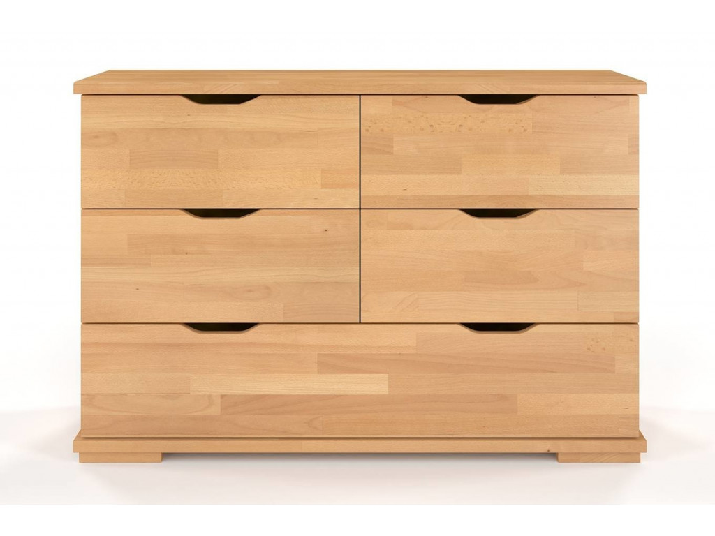 Buková komoda s 5 priestrannými zásuvkami rôznych veľkostí. Minimalistický charakter zdôrazňuje hladká predná časť a zárezy v horných častiach zásuviek namiesto rukovätí. Vďaka tomu bude dizajnovým a funkčným doplnkom každého interiéru.
