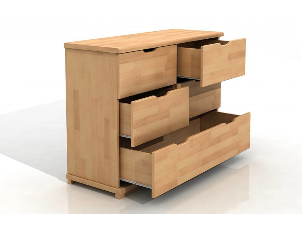 Buková komoda s 5 priestrannými zásuvkami rôznych veľkostí. Minimalistický charakter zdôrazňuje hladká predná časť a zárezy v horných častiach zásuviek namiesto rukovätí. Vďaka tomu bude dizajnovým a funkčným doplnkom každého interiéru.