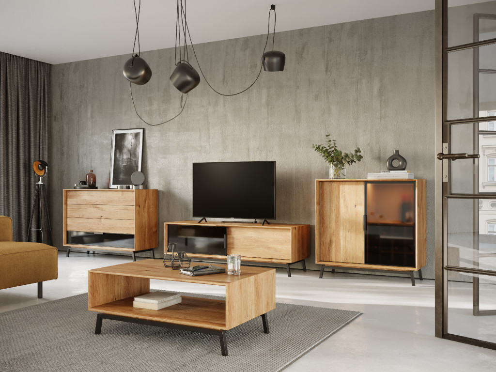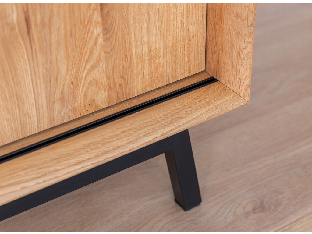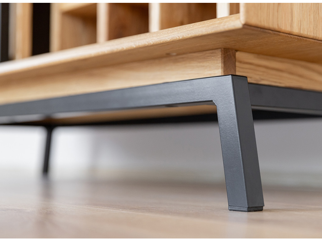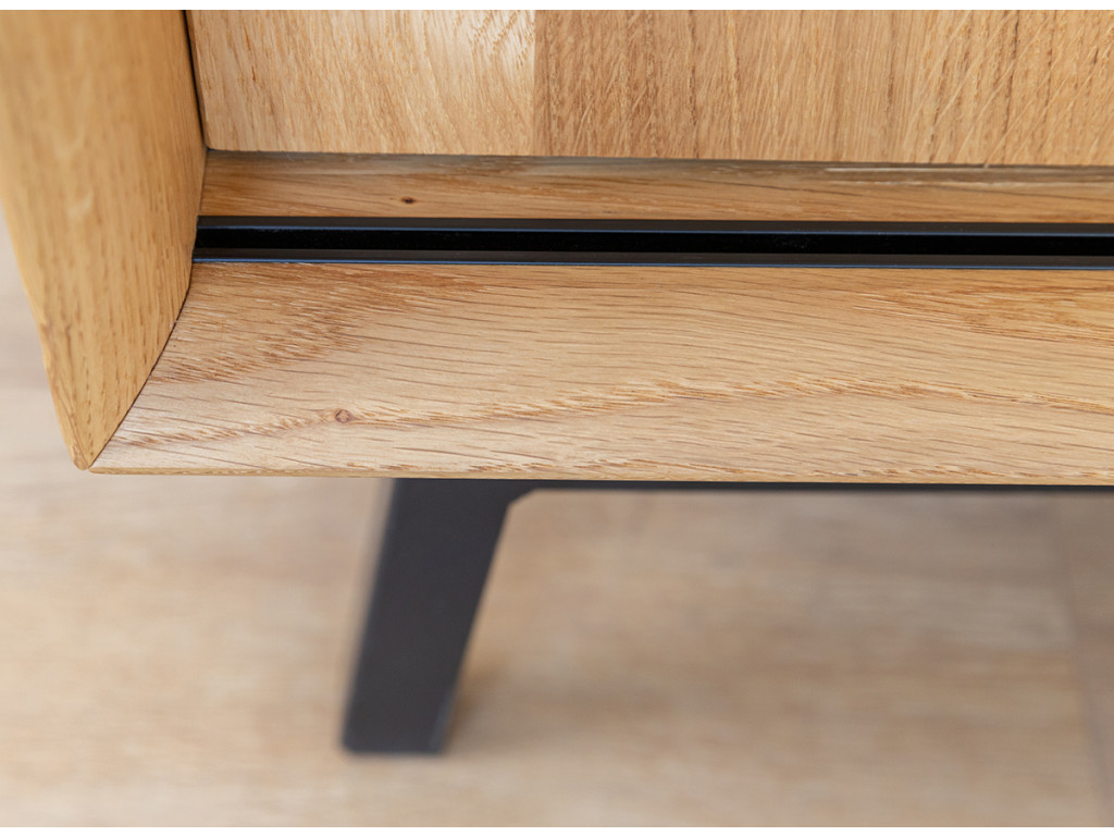 Komoda vyniká zlatou farbou, ktorú získala olejovaním. Olej pri tom preniká do štruktúr dreva a zvýrazňuje prirodzenú zlatistú farbu. Spevňujú ho aj tmavšie krúžky a uzly, ktoré odrážajú krásu prírodného materiálu. Dubová truhlica je osadená na pevnom kovovom ráme, práškovo lakovaná čiernou anódou. Svojou veľkosťou ju môžete umiestniť sólo do malého interiéru alebo integrovať do väčšieho usporiadania priestrannej obývačky či jedálne.