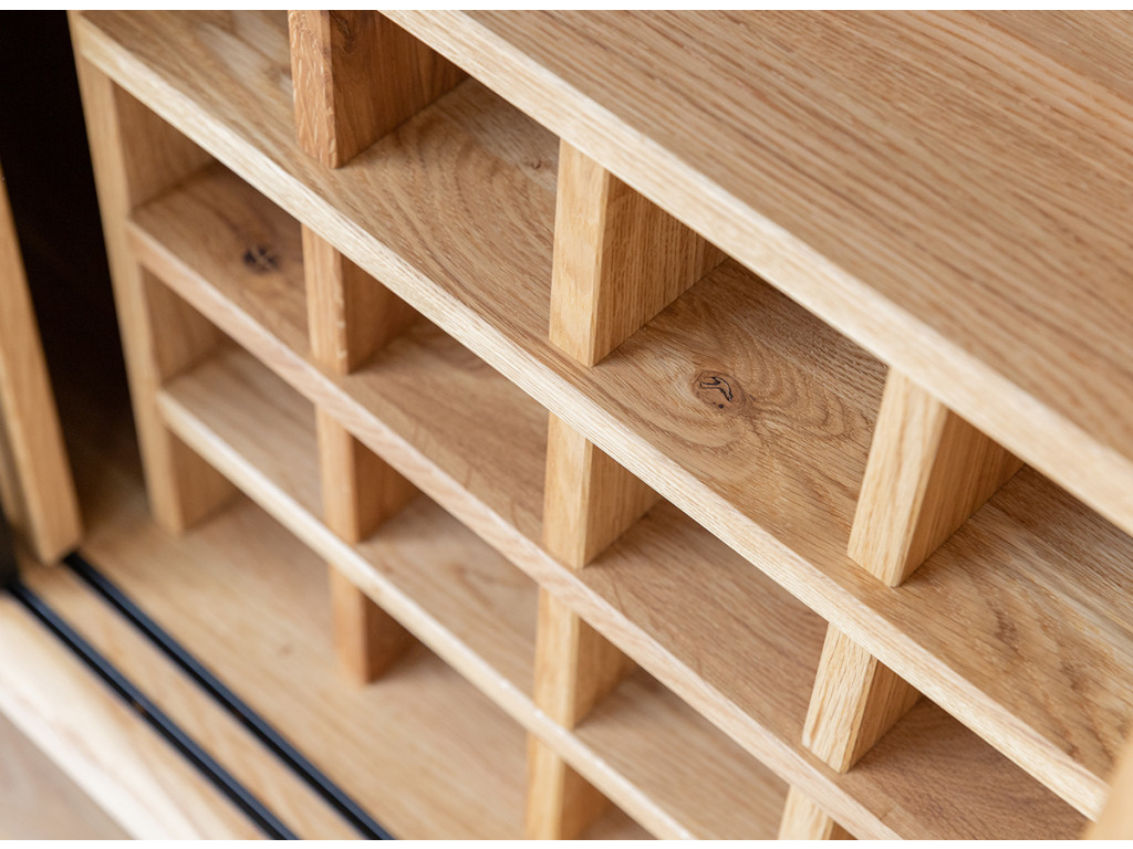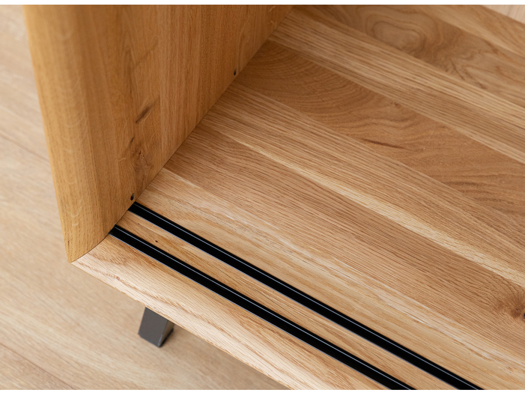 Komoda je vyrobená z kvalitného dubového dreva odolného voči poškodeniu a zničeniu. Na povrchu môžete pozorovať viditeľné nepravidelné čiary a hrče, ktoré sa prirodzene v dreve vyskytujú. Tieto charakteristické línie sú zdôraznené v procese olejovania.