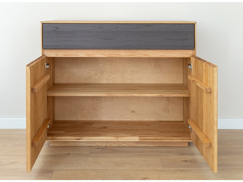 Dubová komoda Sora s grafitovou zásuvkou je premysleným spojením masívneho dubového dreva a jemného moderného akcentu. Teplý prírodný odtieň dubu s výraznou kresbou dopĺňa jedna zásuvka v matnom grafitovom prevedení, ktorá vytvára vyvážený kontrast a zároveň zachováva pokojný charakter nábytku. Celá komoda je vyrobená z masívneho duba a ošetrená prírodným olejom Hesse, ktorý chráni povrch a zvýrazňuje prirodzenú štruktúru dreva. Zásuvka je vybavená kvalitným pojazdom Hettich s tlmičom, ktorý zabezpečuje tichý a plynulý chod. Dvoje dvierka ukrývajú praktickú policu, vhodnú na uloženie kníh, textílií či dokumentov. Vďaka čistým líniám, absencii úchytiek a kompaktným rozmerom sa komoda hodí do obývačky, spálne, jedálne aj pracovne.