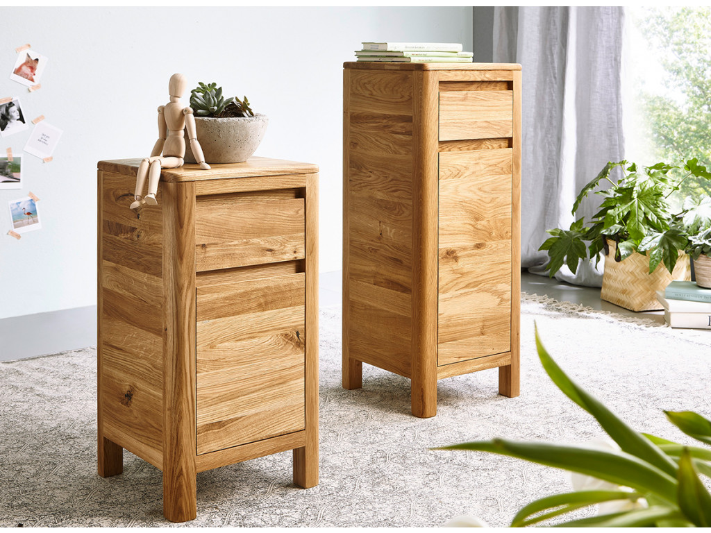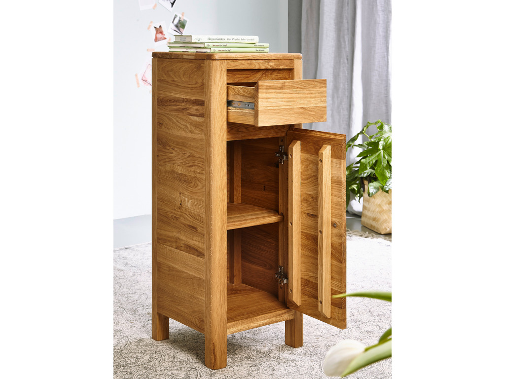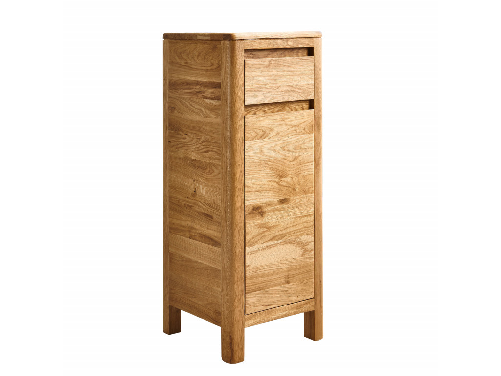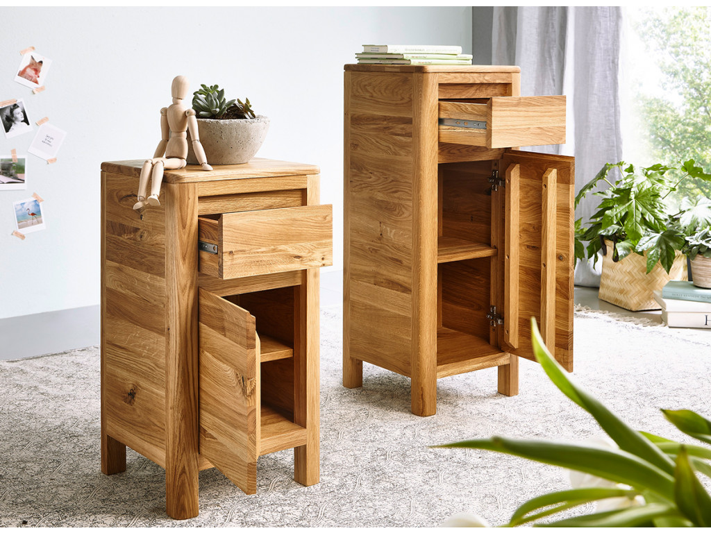 Jednodverová komoda do predsiene Galo prekvapí svojím dizajnom aj úložným priestorom. Okrem 2 políc za dvierkami disponuje aj zásuvkou, do ktorej vložíte drobnosti ako kľúče, peňaženky a iné. Je vyrobená z masívneho duba, ktorý vydrží roky.