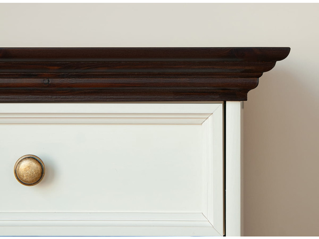 Biela komoda je vyrobená z masívneho dreva a je odolná voči poškodeniu. Použité borovicové drevo je zárukou, že nábytok bude svoju úlohu plniť mnoho rokov. Prstene v dreve viditeľné na povrchu dodávajú prirodzený štýl a extravaganciu. Vrchná doska komody je vo farbe orech.