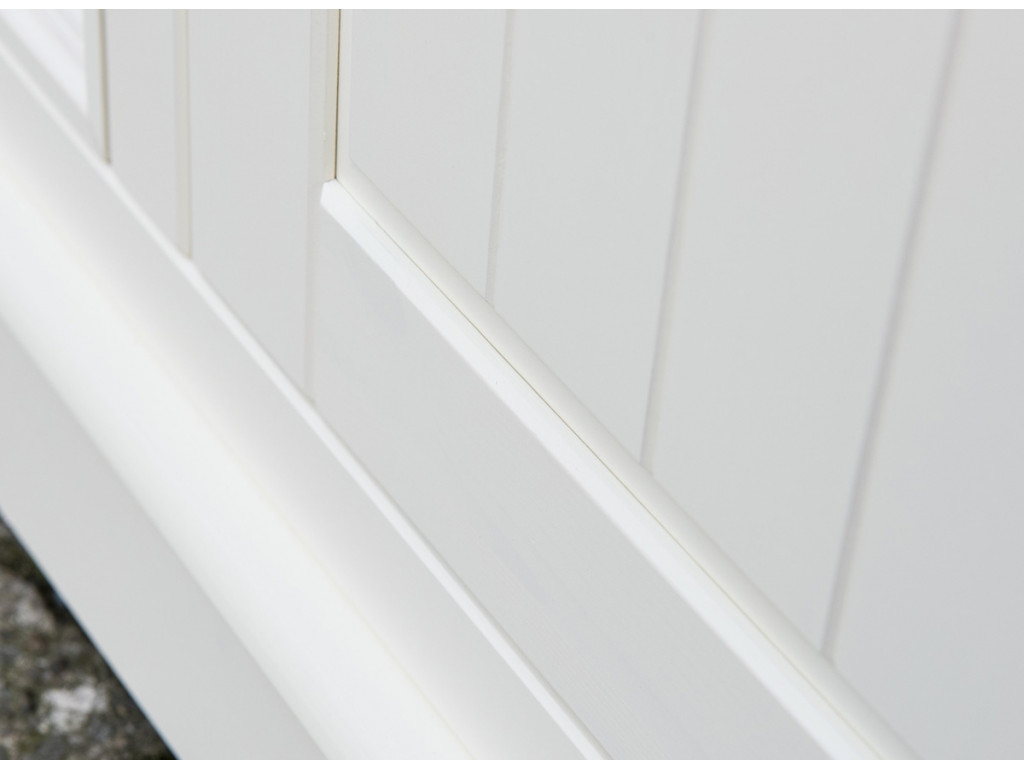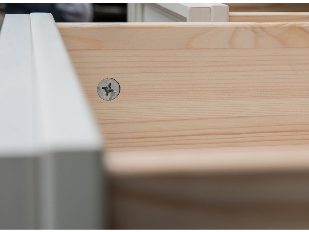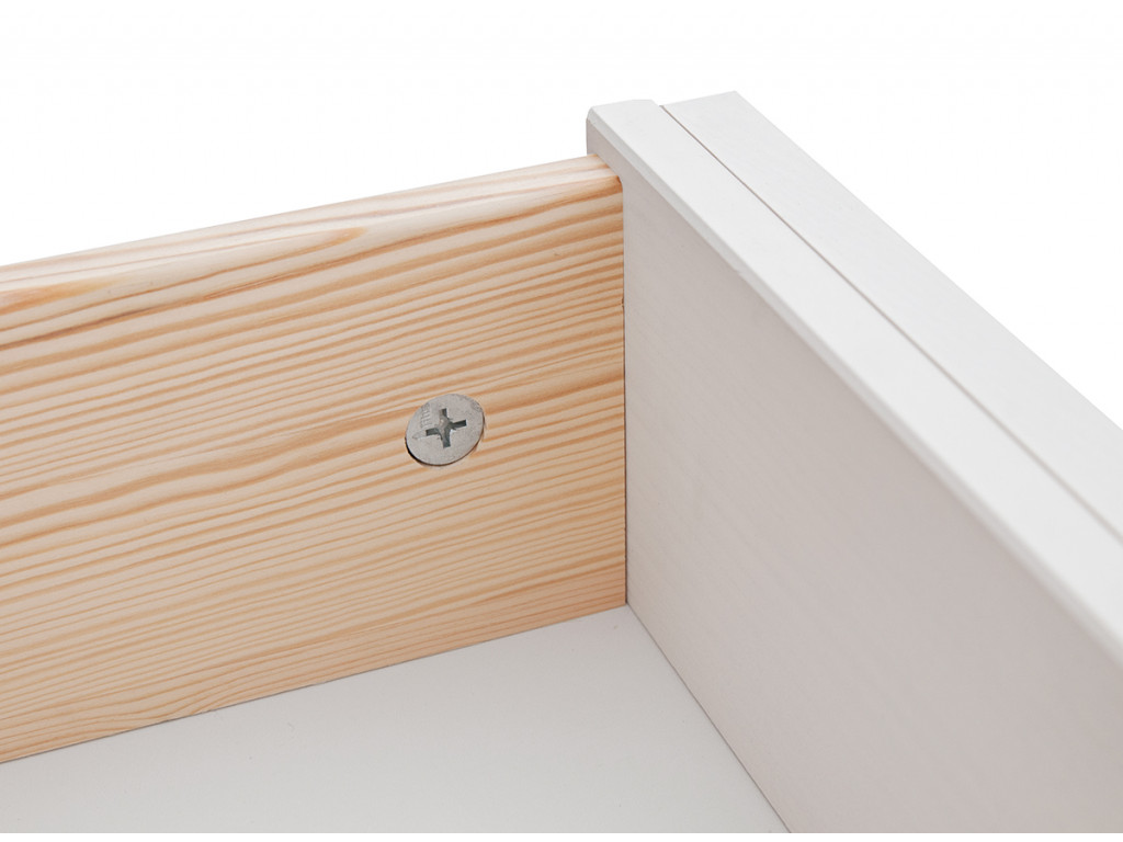 Na výrobu nábytku bolo použité vysokokvalitné borovicové drevo. Fínska borovica je strom spojený hlavne s racionálnym pestovaním tohto druhu. Výberom nášho nábytku si môžete byť istí, že prírodné prostredie nebolo pri jeho výrobe ovplyvnené. Napriek tomu, že sa jedná o biely kus nábytku, môžete na jeho povrchu ľahko vidieť štruktúru dreva. Je to spôsobené tým, že biela farba (RAL 9010) na vodnej báze, ktorá pokrýva povrch drevenej komody, poskytuje 85 % krytie. Drevená komoda je potiahnutá farbou v odtieni teplej bielej. Bočné strany zásuviek nie sú vybielené. Vrchná doska je namorená moridlom na vodnej báze s krytím približne 40 % v odtieni dub.