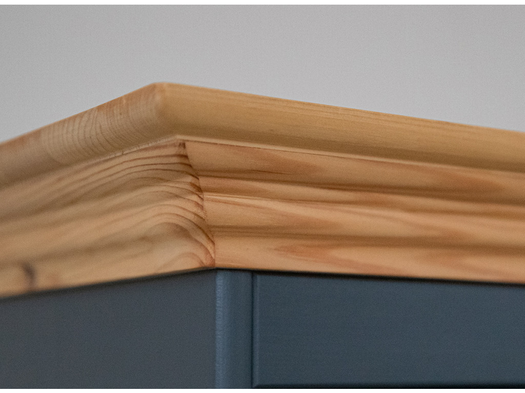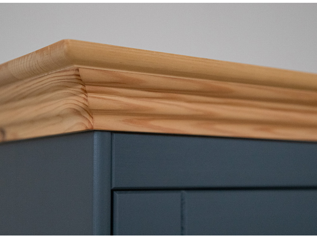Na výrobu nábytku bolo použité vysokokvalitné borovicové drevo. Fínska borovica je strom spojený hlavne s racionálnym pestovaním tohto druhu. Výberom nášho nábytku si môžete byť istí, že prírodné prostredie nebolo pri jeho výrobe ovplyvnené. Napriek tomu, že sa jedná o tmavý kus nábytku, môžete na jeho povrchu ľahko vidieť štruktúru dreva. Je to spôsobené tým, že grafitová farba na vodnej báze, ktorá pokrýva povrch drevenej komody, poskytuje 85 % krytie. Drevená komoda je potiahnutá farbou v odtieni teplej grafitovej. Vrchná doska je namorená moridlom na vodnej báze s krytím približne 40 % v odtieni borovica.