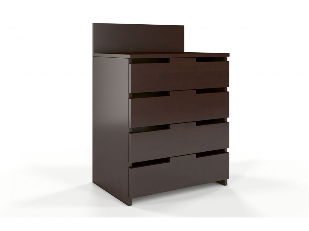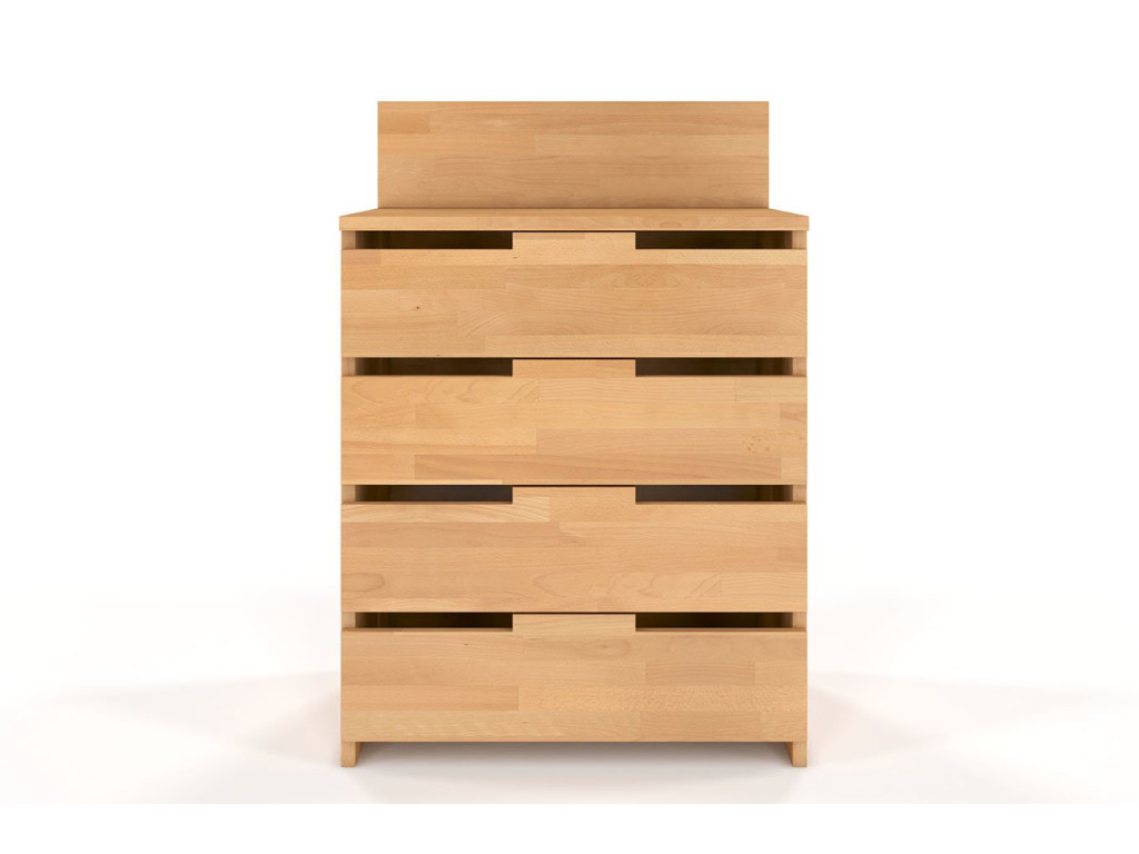 Neobvyklý dizajn drevenej komody spestrí interiér a zvýšený zadný diel dodá nábytku jedinečný charakter. Masívna komoda z buku má 4 priestranné zásuvky so širokými obdĺžníkovými výrezmi namiesto klasických vyčnievajúcich úchytiek.