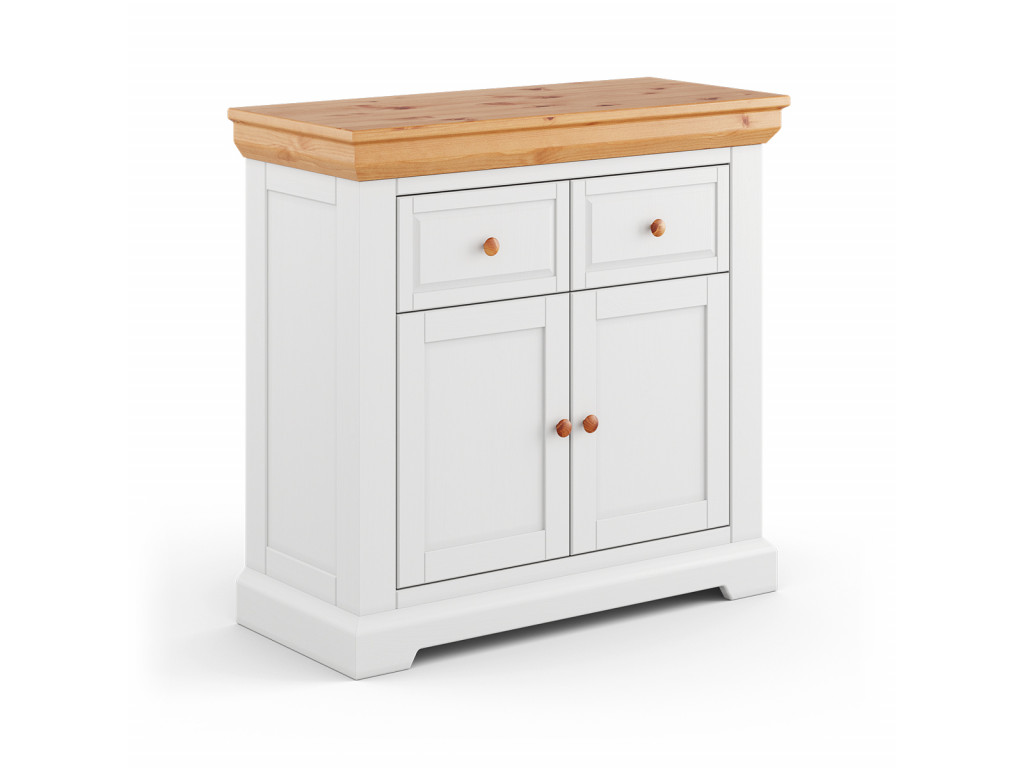 Komoda ponúka priestrannú hornú časť, veľké skrinky a zásuvky. Vrchná doska z prírodného borovicového dreva je kombinovaná s bielym korpusom a prednou časťou.