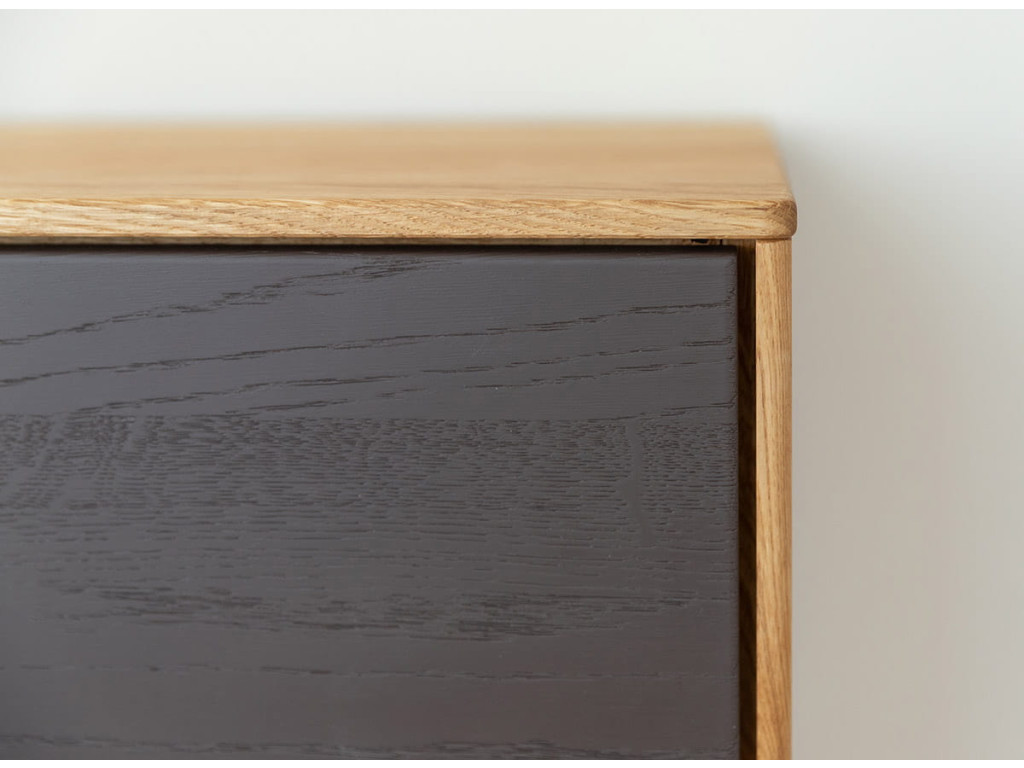 Široká dubová komoda Sora s grafitovými zásuvkami je harmonickým spojením prírodného masívneho dubu a jemného moderného kontrastu. Teplý, jednotný dubový korpus s výraznou kresbou dreva dopĺňajú dve zásuvky v matnom grafitovom odtieni, ktoré dodávajú komode vizuálnu hĺbku bez narušenia jej pokojného charakteru. Celý kus je vyrobený z masívneho dubového dreva a ošetrený prírodným olejom Hesse, ktorý chráni povrch, zvýrazňuje štruktúru dreva a umožňuje mu prirodzene starnúť. Grafitové čelá zásuviek sú ošetrené ekologickou farbou s matným povrchom, odolnou voči každodennému používaniu. Komoda ponúka dve zásuvky s pojazdmi Hettich s tlmičom a tri dvierka, za ktorými sa nachádza úložný priestor rozdelený dvomi policami. Vďaka vyváženým proporciám a minimalistickému dizajnu sa hodí do obývačky, jedálne aj kancelárie, kde poskytuje poriadok bez vizuálneho chaosu.
