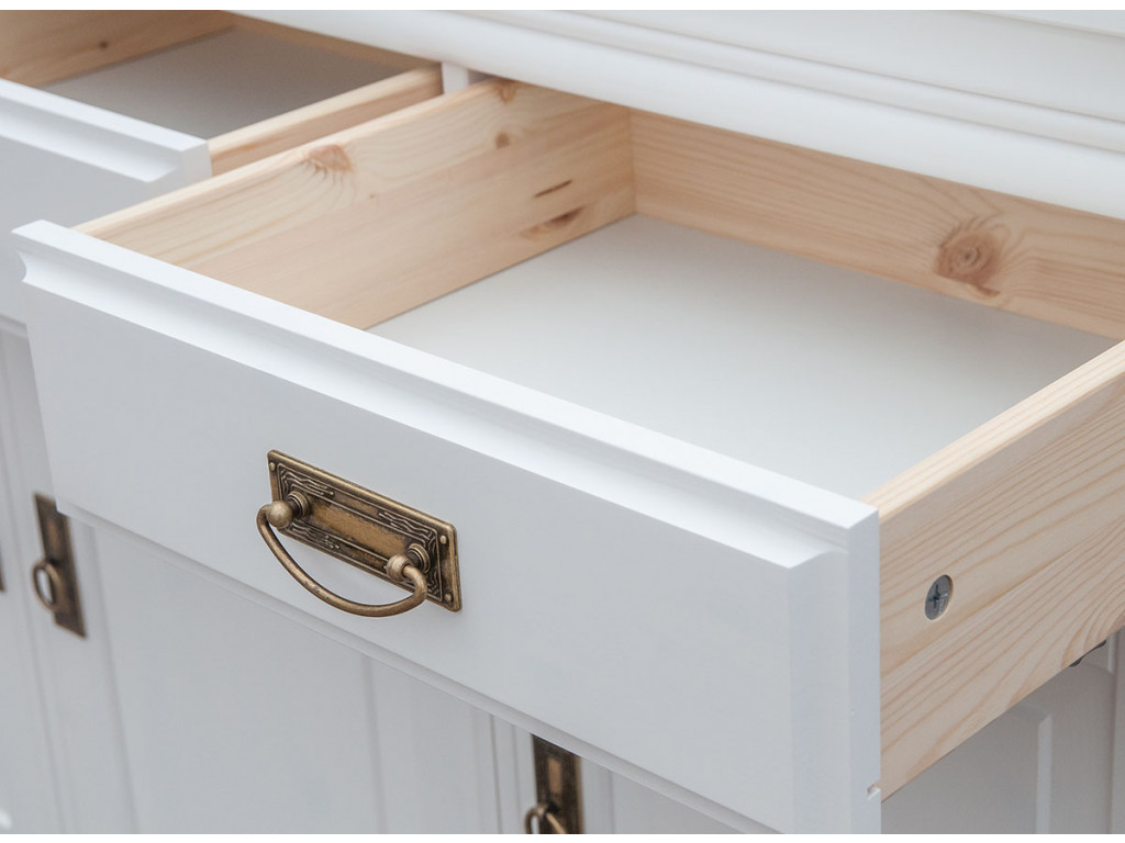 Nábytok je okrem svojho pôvodného vzhľadu aj veľmi užitočný. Ľahko doň môžete uložiť veci, ktoré nechcete svojim hosťom predstavovať. Na druhej strane masívna a dekoratívna doska stola je miestom, kde môžete vystaviť kvety alebo svoje obľúbené dekorácie. Biela drevená komoda je vybavená aj 3 zásuvkami, ktoré sú ideálnym úložným priestorom na dokumenty, kľúče a ďalšie drobnosti.