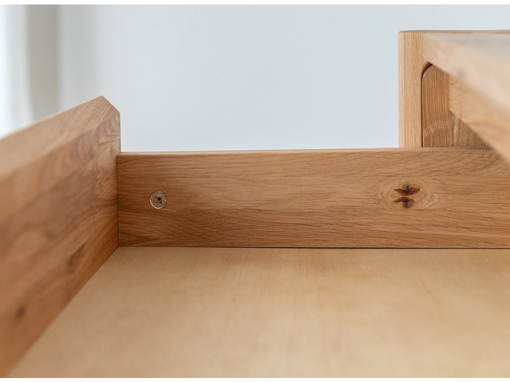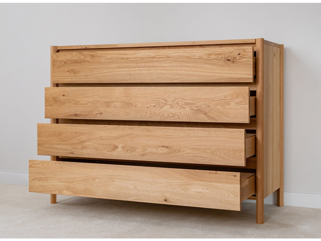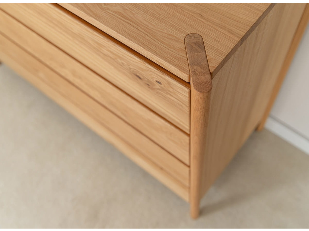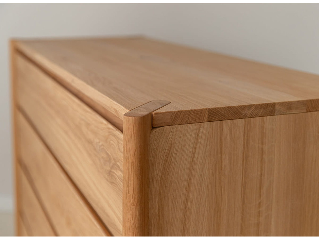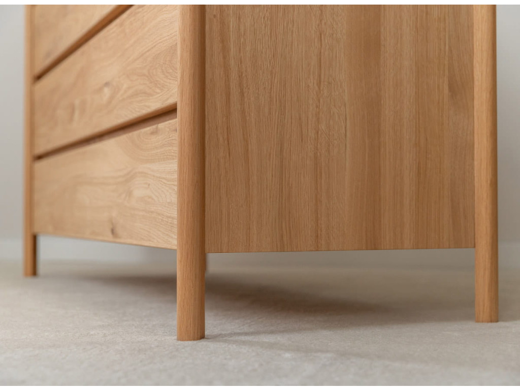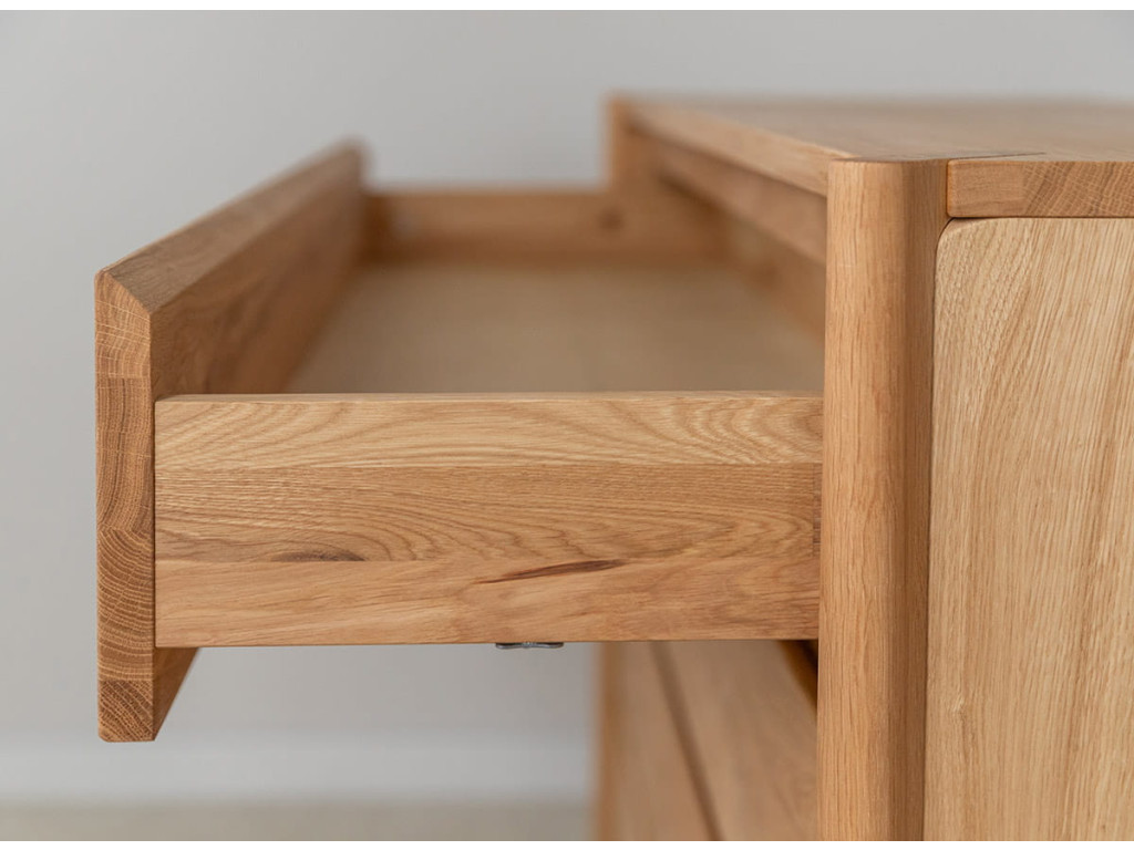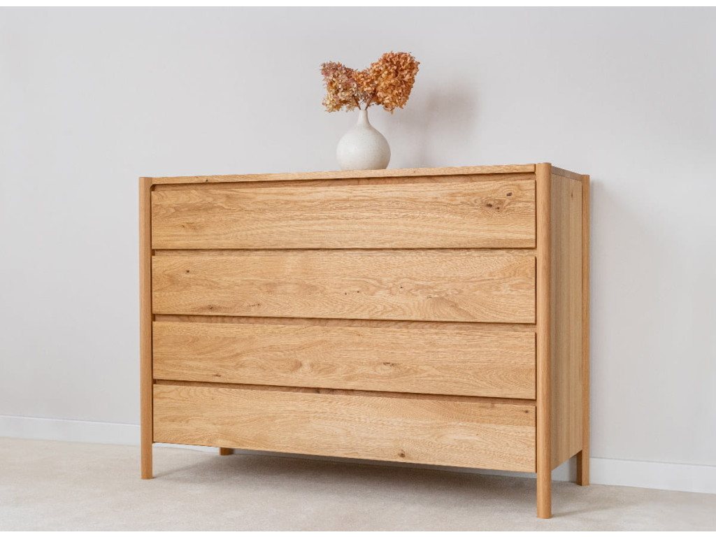 Masívna dubová komoda z kolekcie Campi vyniká minimalistickým dizajnom s frézovanými čelami bez úchytiek, ktoré podčiarkujú jej moderný vzhľad. Je vyrobená z prírodného dubového dreva s olejovanou polomatnou povrchovou úpravou, ktorá zvýrazňuje kresbu dreva a zároveň ho chráni. Ponúka 4 priestranné zásuvky s kvalitným pojazdom Hettich s tlmeným dovieraním, čo zabezpečuje komfort pri každodennom používaní. Vďaka pevnej konštrukcii a nadčasovému vzhľadu sa hodí do moderných aj škandinávskych interiérov.