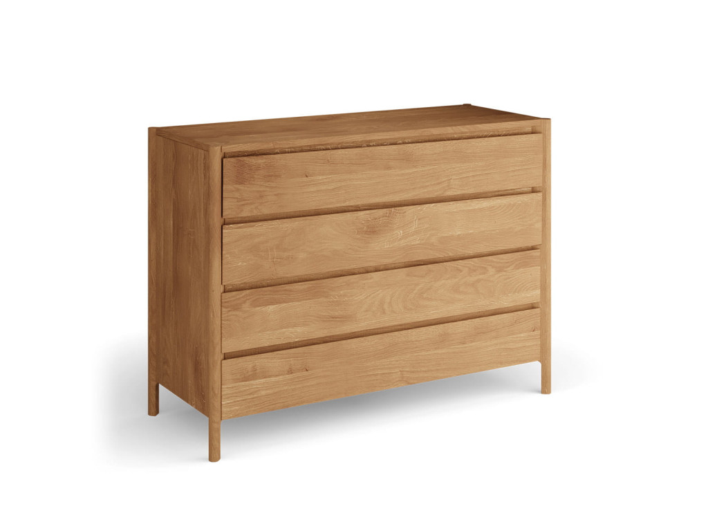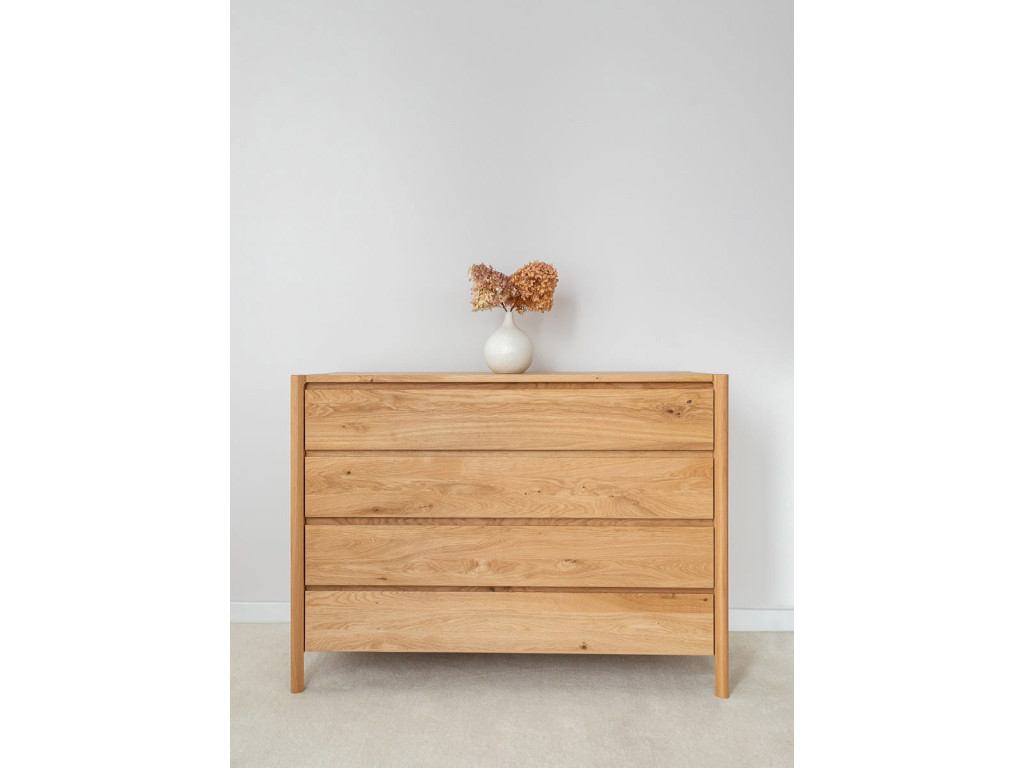 Masívna dubová komoda z kolekcie Campi zaujme čistým minimalistickým dizajnom bez úchytiek a precíznym spracovaním. Je vyrobená z prírodného dubového dreva s olejovanou polomatnou povrchovou úpravou, ktorá zvýrazňuje jeho kresbu a chráni povrch. Ponúka 4 priestranné zásuvky s tichým dovieraním pre pohodlné každodenné používanie. Ideálna voľba pre moderný interiér, kde sa spája funkčnosť, kvalita a nadčasový vzhľad.