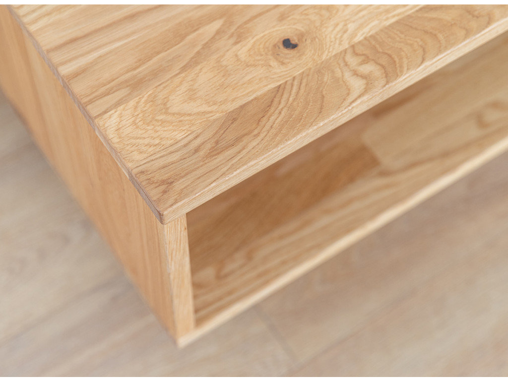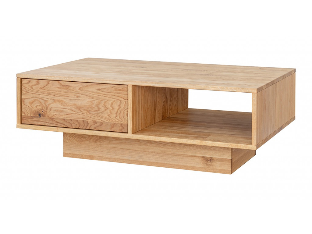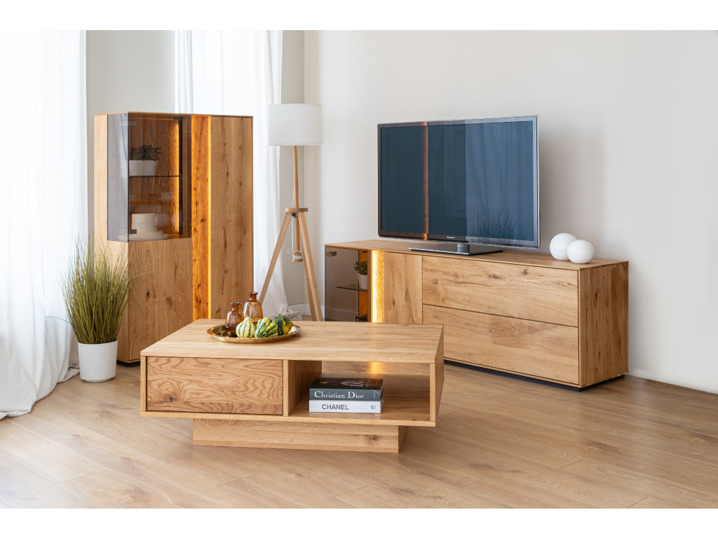 Konferenčný stolík z kolekcie Collodi vyžaruje prirodzenú hrejivosť, ktorú charakterizuje zlatý odtieň dubového dreva. Viditeľné letokruhy a uzly v dreve svedčia o autenticite a jedinečnom charaktere a podčiarkujú jedinečný dizajn produktu. Pod vrchnou doskou stolíka sa nachádza otvorený výklenok, ktorý celok vizuálne odľahčuje a priestranná zásuvka na drobnosti.