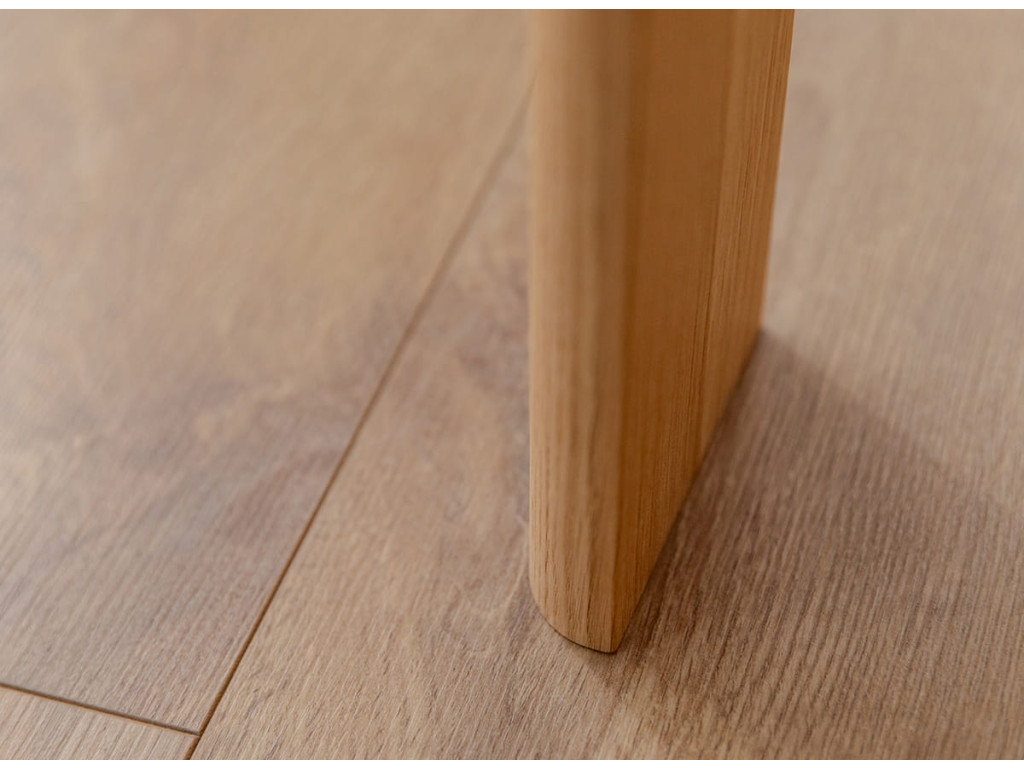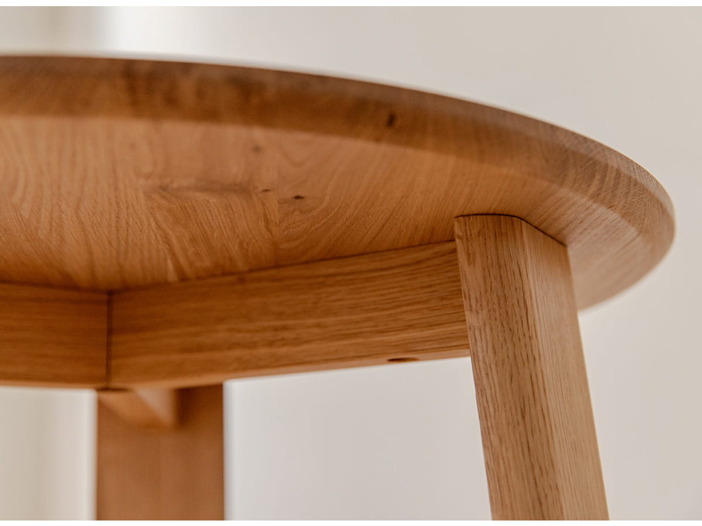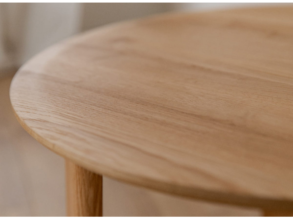 Drevo použité na výrobu stolíka je ošetrené prírodným olejom, ktorý zvýrazňuje jeho kresbu a zároveň poskytuje ochranu pred každodenným opotrebením. Povrch je príjemný na dotyk – teplý, hladký, akoby vás pozýval spočinúť. Každý prvok, od stabilných nôh až po starostlivo zaoblené hrany dosky, bol navrhnutý s ohľadom na dlhodobé používanie a vizuálnu čistotu.