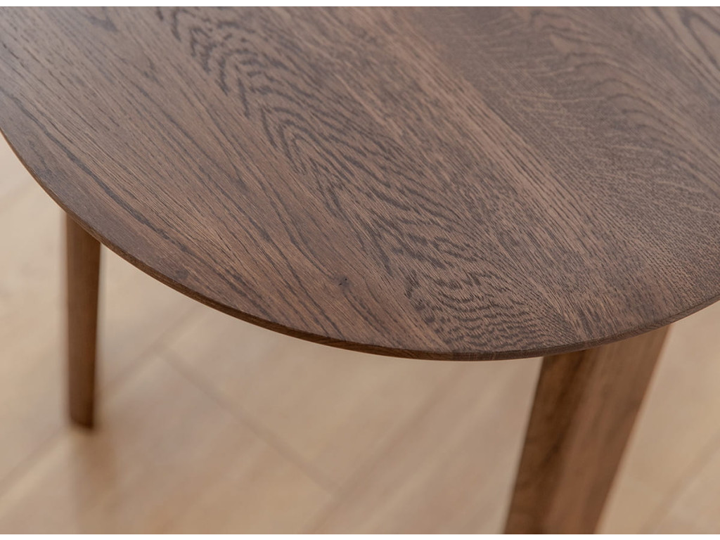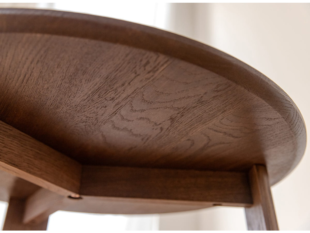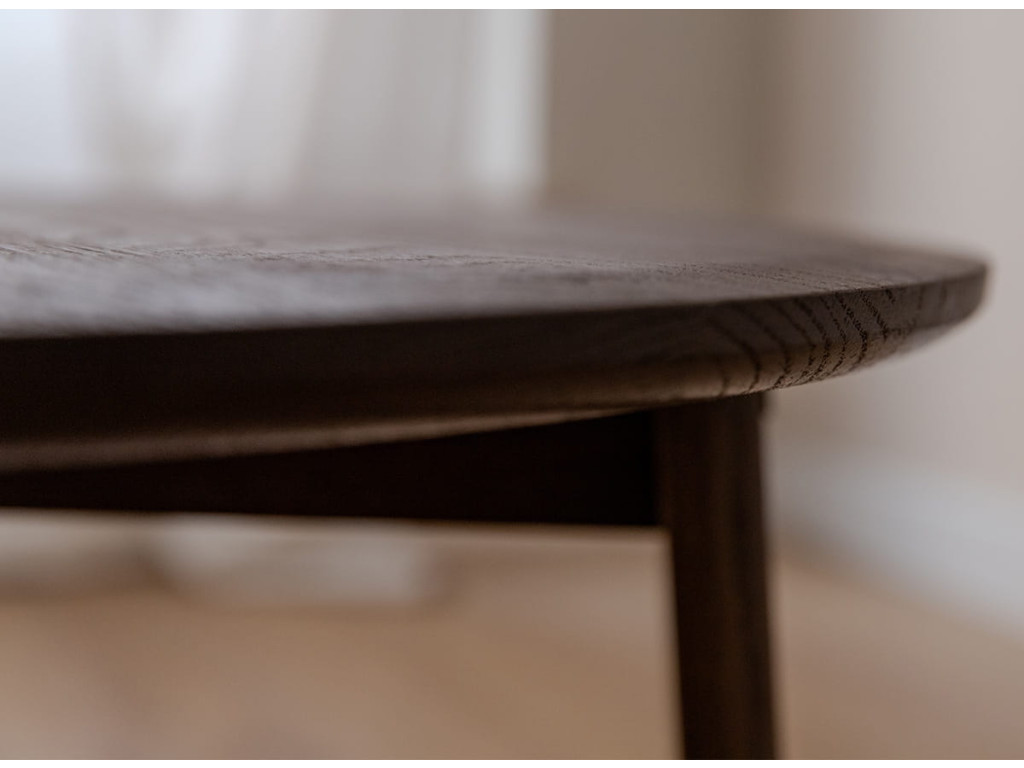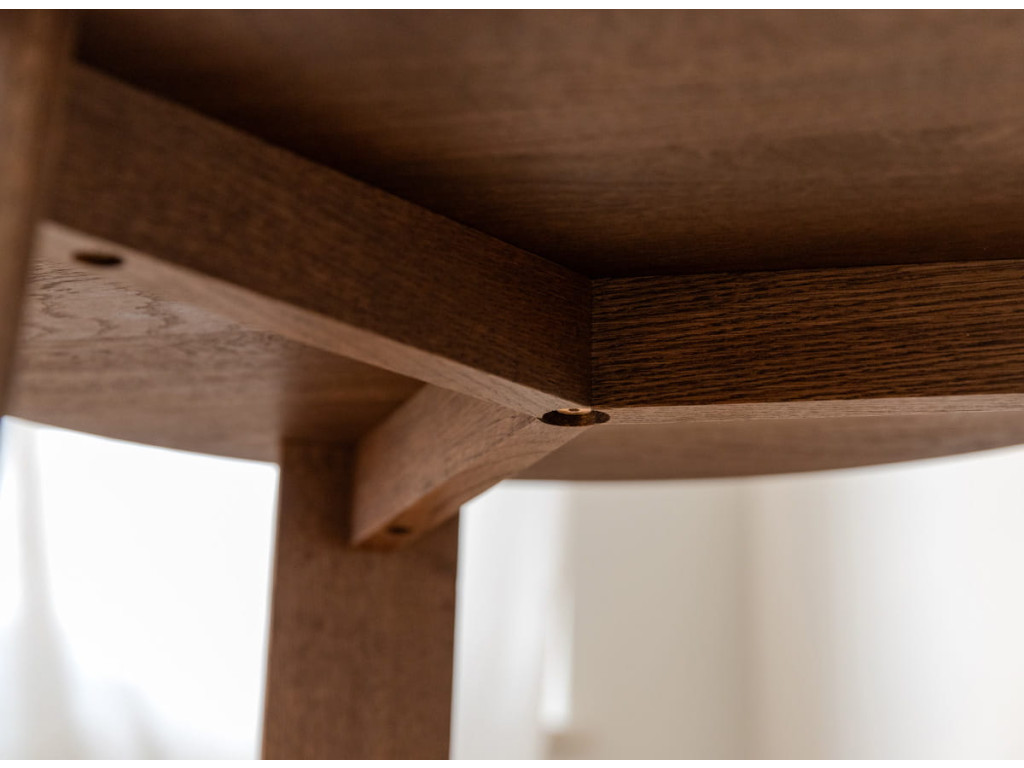 Dubové drevo použité na výrobu stolíka je ošetrené prírodným olejom, ktorý zvýrazňuje jeho kresbu a zároveň poskytuje ochranu pred každodenným opotrebením. Povrch je príjemný na dotyk – teplý, hladký, akoby vás pozýval spočinúť. Každý prvok, od stabilných nôh až po starostlivo zaoblené hrany dosky, bol navrhnutý s ohľadom na dlhodobé používanie a vizuálnu čistotu.