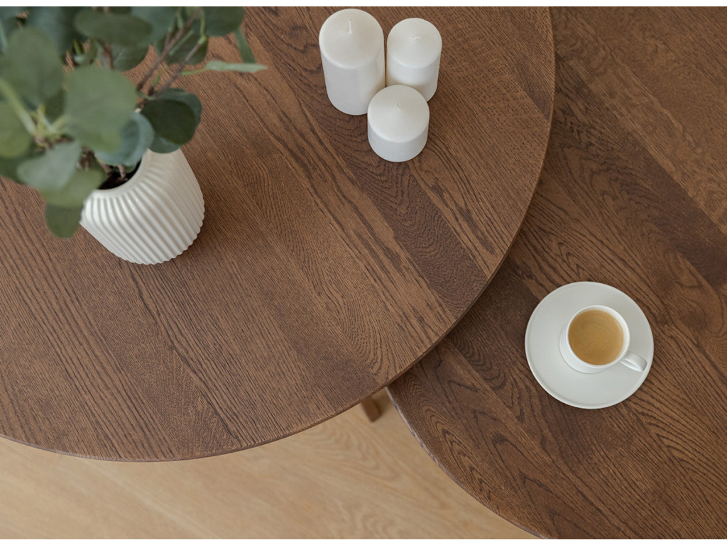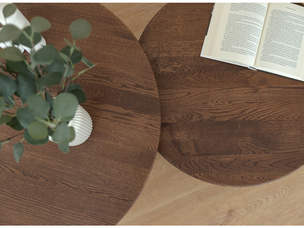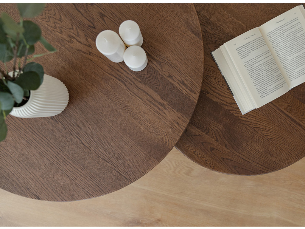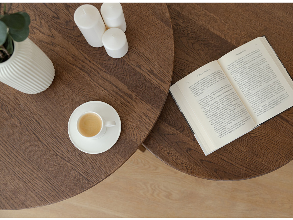 Vneste do svojej obývačky čistý a sofistikovaný vzhľad s okrúhlym konferenčným stolíkom Tello. Je vyrobený z masívneho duba, ktorý vyniká svojou trvácnosťou a odolnosťou proti opotrebeniu. Jeho hnedý tón dokonale zapadne do moderných aj tradičných interiérov.