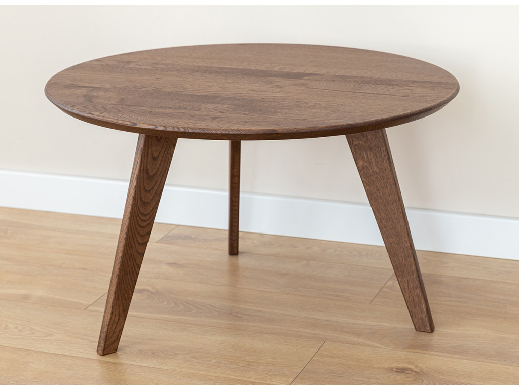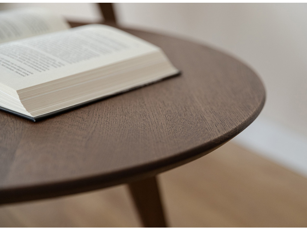 Okrúhly hnedý stôl bude fungovať ako šikovný kus nábytku, na ktorý môžete odložiť drobné predmety dennej potreby. Na drevený stôl môžete tiež položiť občerstvenie alebo knihu, ktorú čítate. Doska stola meria v najširšom mieste 70 cm.